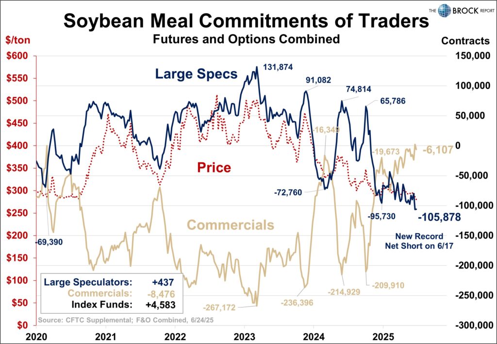 Soybean Meal specs hit a new record net short last week, and were very modest buyers in the week ended 6/24. Commercials are very near their record net long. This is a BULLISH setup. The price chart on the other hand…..