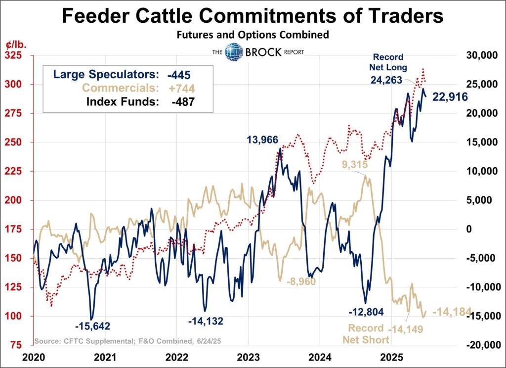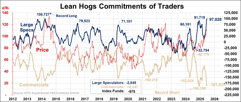 Specs are extremely long fats and feeders, and there is considerable downside potential in this market. Specs were net sellers of both markets the past two weeks, but this also happened in April.