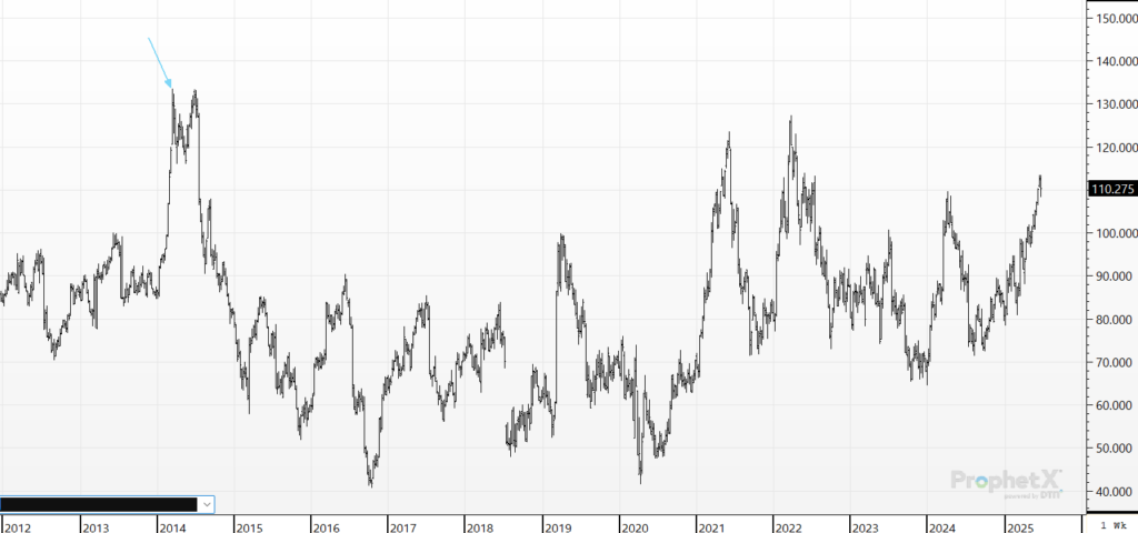 We’re going with the longer term COT chart below, so you can see the last time large specs were this long was in 2014, and they’ve only come close a couple other times. The price chart below is a weekly continuous most active futures chart, and the arrow is pointing to where the large spec long peaked. When we say spec selling can pressure a market, this is what we are talking about.