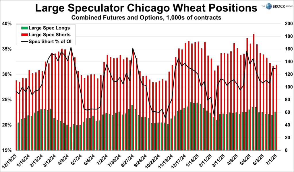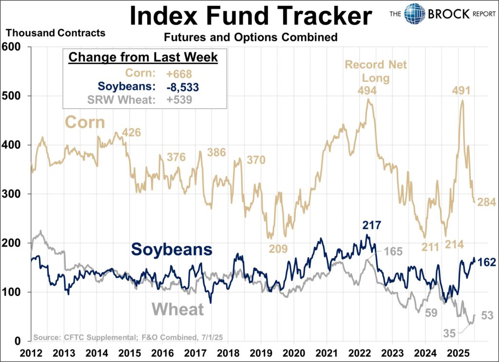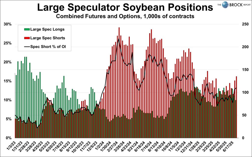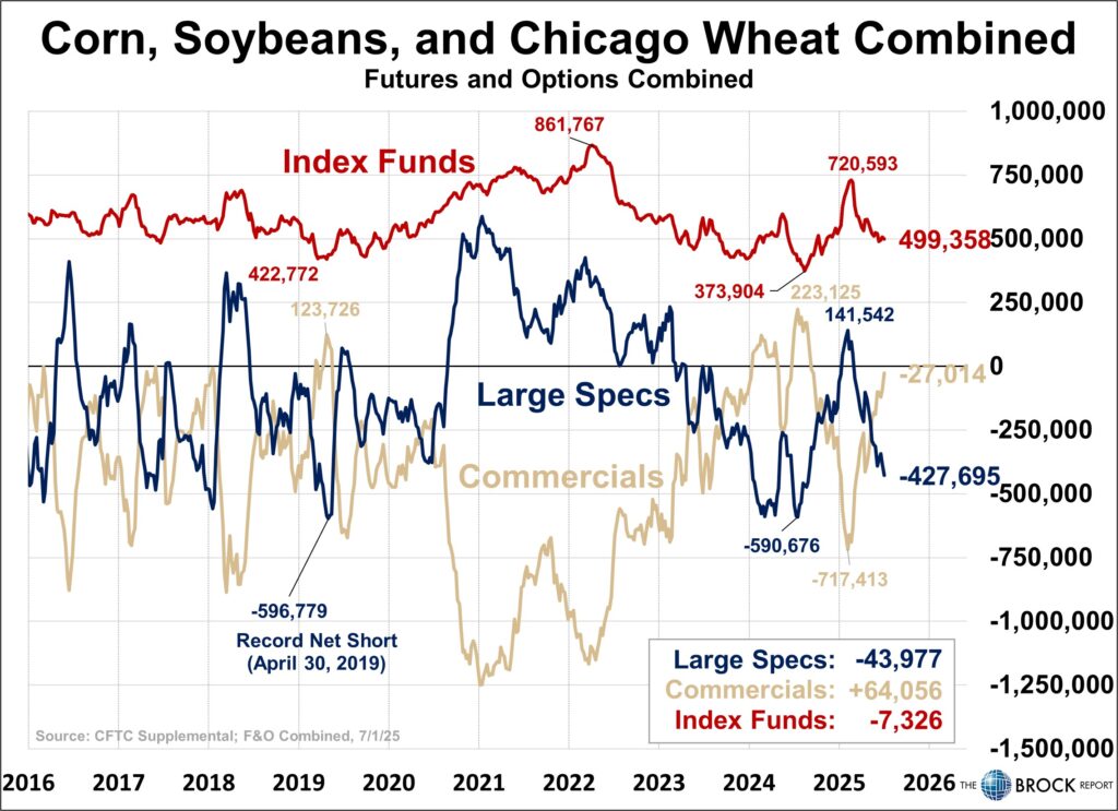 Large specs in soybeans are setup similarly to how corn specs were back in February. While they are not net long this market, they are well above their recent net short position from mid 2024, and have plenty of room to continue selling while staying well within their typical exposure range. Our readers will know that specs went for months without buying/selling two weeks in a row, but they have now been sellers for two consecutive weeks. This is not a positive trend, but also not as large a red flag as it was for corn in Feb. It is cause for concern but not the most important factor to the bean complex at the moment.