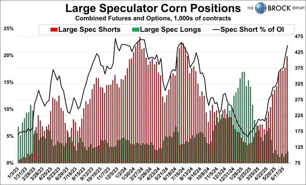 Large speculators continue to hammer the corn market, now just ~40,000 contracts from their largest all time net short position. They’ve been net sellers 17 of the last 19 weeks, which takes us back to February when we warned that specs long liquidation could be a major issue for this market. Just two weeks ago specs set a record for the fewest number of long positions since 2009.
