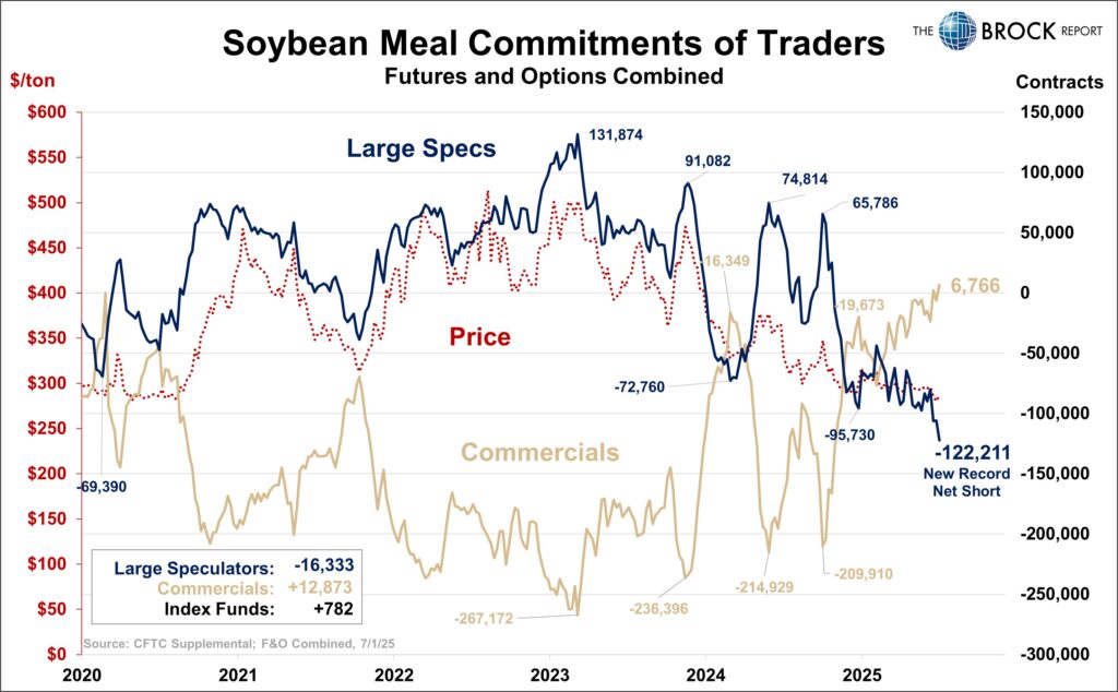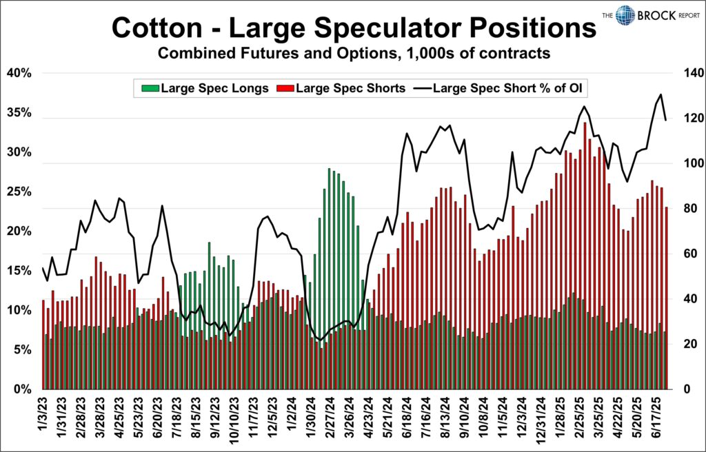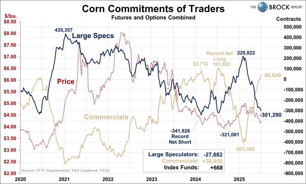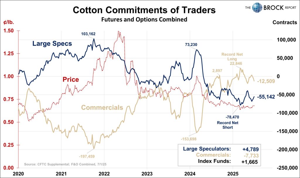 While all of this sounds bearish, it’s not. At some point the 400,000+ short positions large specs hold will need to be covered, and if there is a significant shift in fundamentals they may run for the exit…just the opposite of what has happened since late February. There is little sign that is about to happen though, and we are not yet in the “bottom is in” camp. This report is thorugh July 1, a day that made new contract lows, followed by two days of likely short covering to pop the market. As you well know, price action today, the first post holiday trading day, was extremely negative and may indicate that the last two days was simply short covering ahead of the weekend.