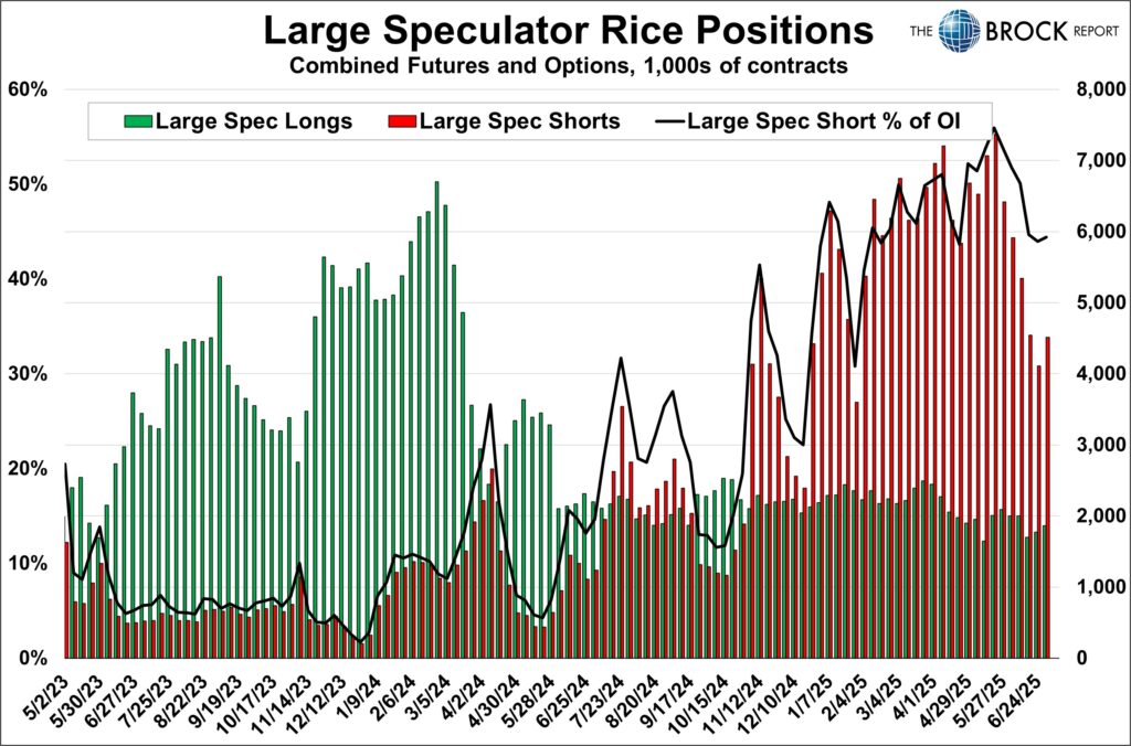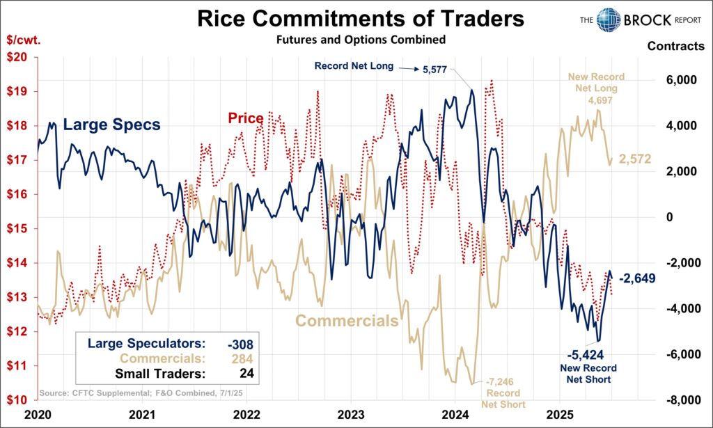 Specs were modest sellers this week after being net buyers 10 of the last 11 weeks. This short covering caused futures to rally ~9.5% off their contract low in May, but has not helped price action the last two weeks. The correlation between spec activity and the futures market is not nearly as strong in rice as it is in corn or soybeans, but we still believe this setup will be supportive and creates the potential for sharp rallies like we saw from mid May to mid June.