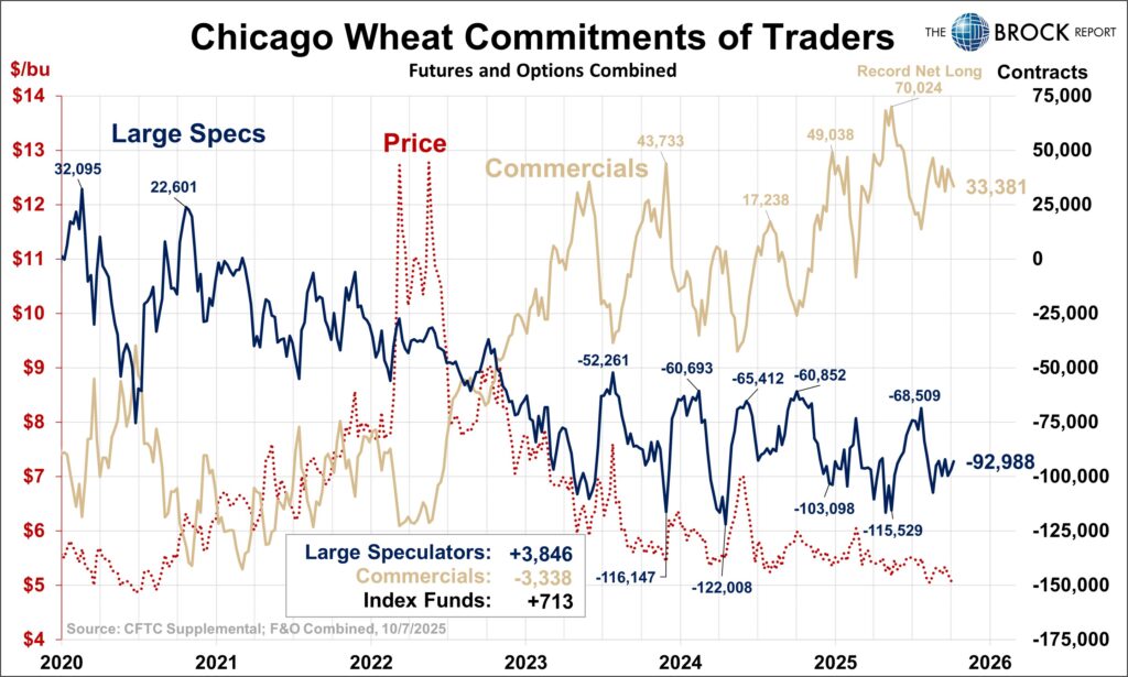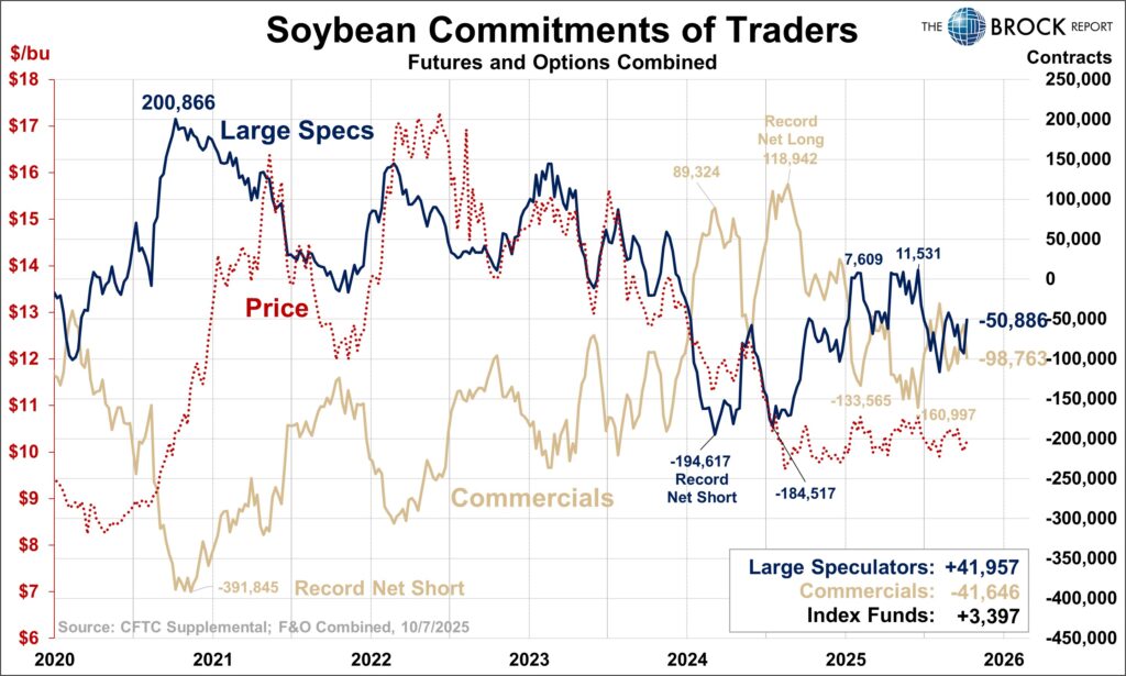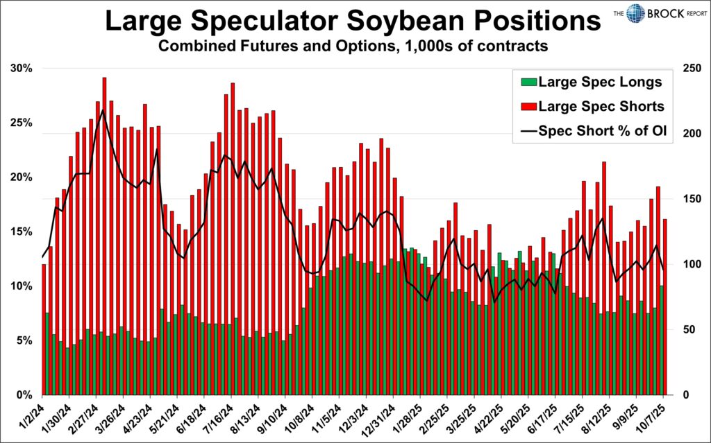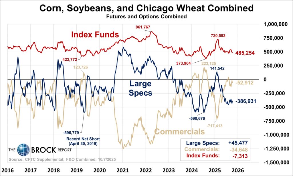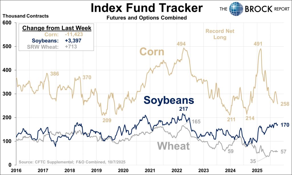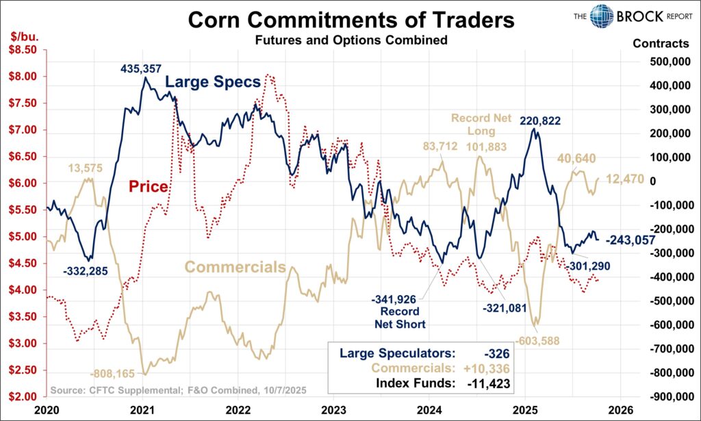 Corn prices since early October really have not done much. They dropped about 10¢, then rallied about 25¢, and then sold off about 20¢. With inconsistent price action, we would not expect to see any extreme movement in the large spec position. Nothing in this report, we’ll check back in next week.