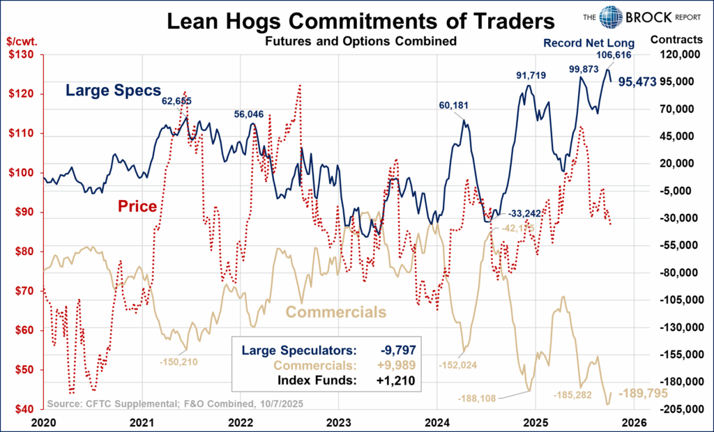 The Cattle COTs are a mixed bag as far as this 20-20 hindsight / educational review goes. Feeders gave their warning signal LOUD AND CLEAR several weeks before the selloff started, not to say that this information made trading them any easier, in fact possibly more difficult. This release showed significant buying, and as you can see below futures followed suit. The previous selling failed to produce a drop in prices, though again, this was a warning signal and not a ‘trade timing indicator’. It will be interesting to see this COT data as it comes out.