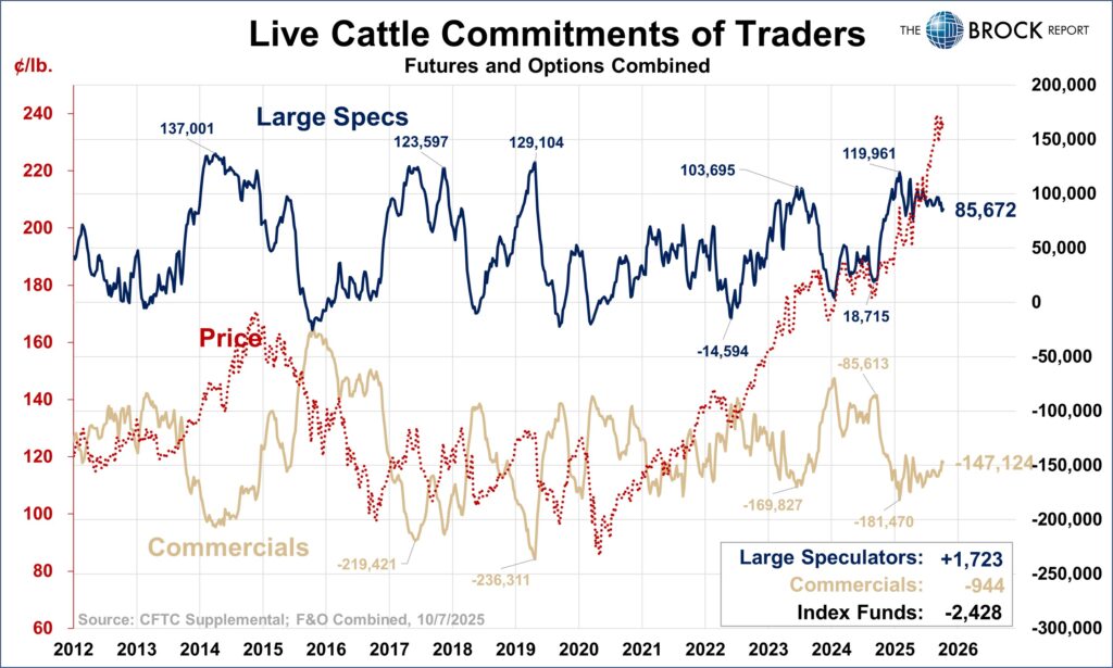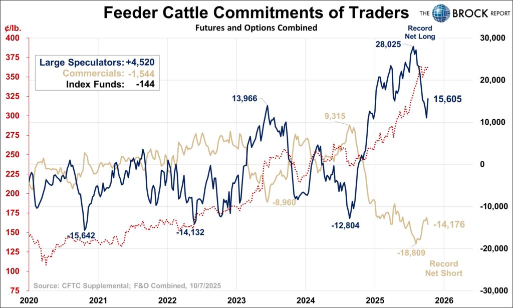 This setup is LITERALLY why we use these reports. Large specs at a record net long, commercials at a record net short, prices at elevated levels all add up to the potential for a massive selloff. While the data through Sep 30 (released earlier this week) showed some modest selling, in fact the first week of large spec net selling after 5 straight weeks of buying, it would have been enough to get our attention but not really convince us a selloff was imminent. This report however showed pretty significant net selling and would have absolutely set off some alarm bells. Thankfully, the technical action was enough to trigger us to advise some hedge protection, but this data may have made us more aggressive.