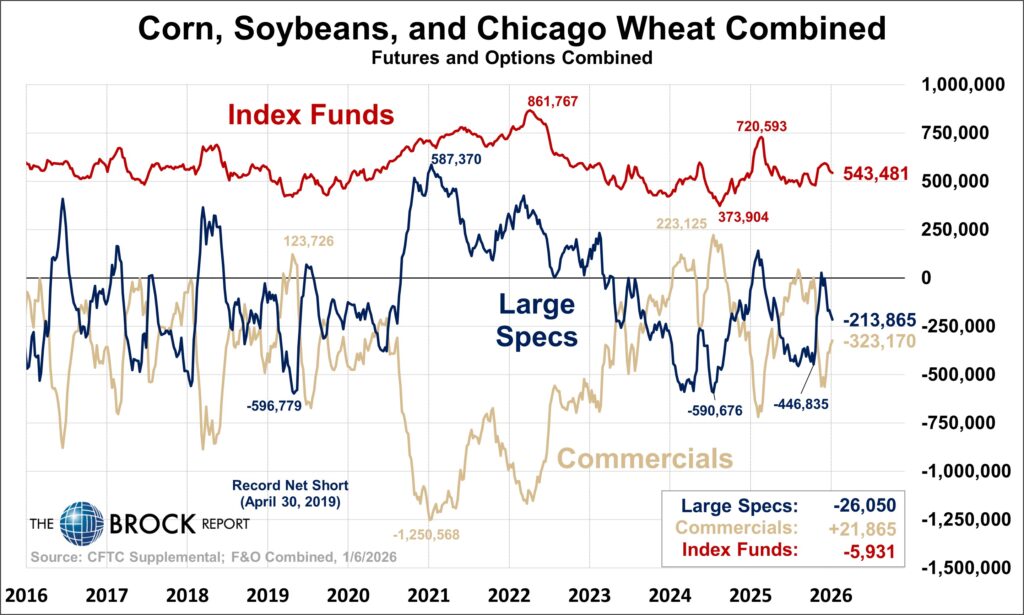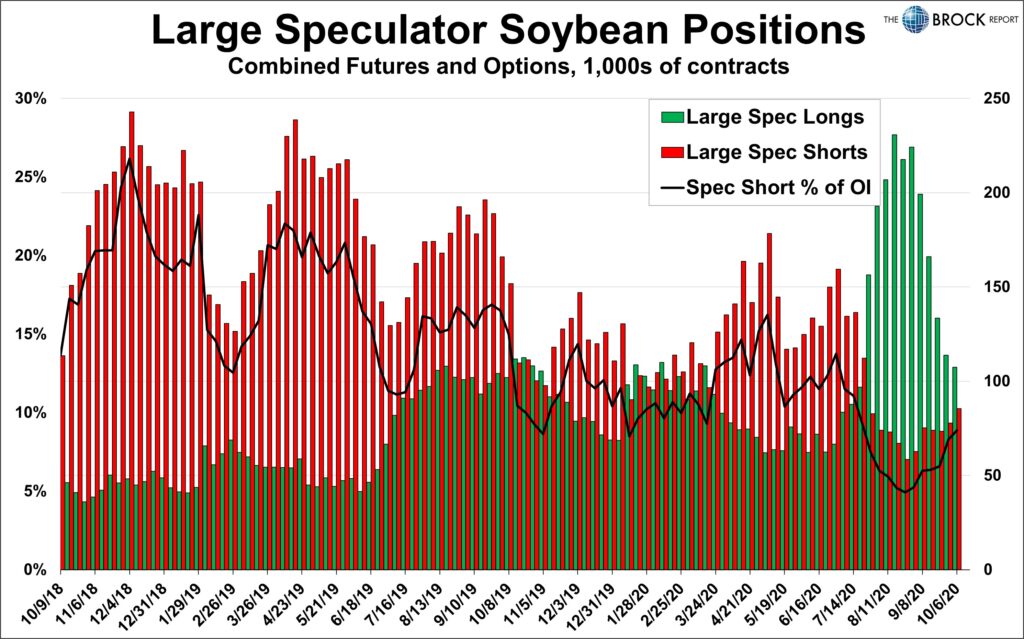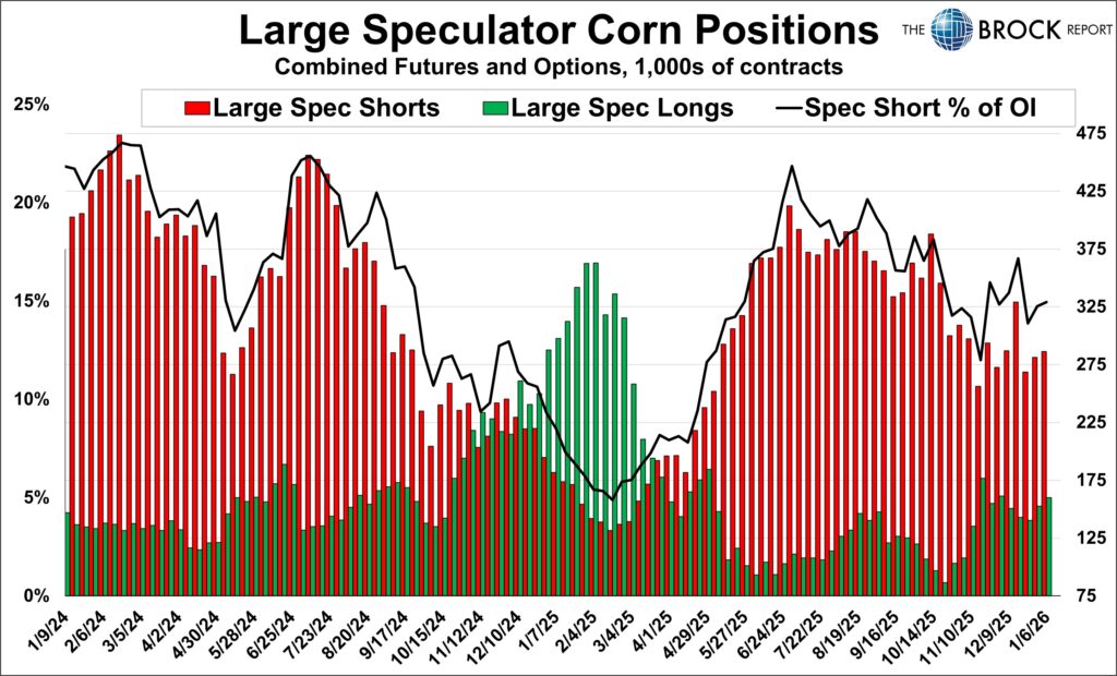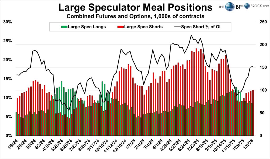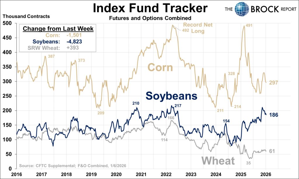 Bottom line is large speculators are still selling this market, but keep in mind the data is only current through Tuesday. Futures mounted a strong rally on Monday, but if that was driven by spec buying, that buying was overshadowed by the previous week’s selling in this data. We expect to see a neutral to modest net buying in the next report. Until we see that, there is reason to be concerned as large specs still have about 100,000 longs that they could liquidate, and they hold just ~60,000 shorts, a position they could increase. Monday’s USDA reports will likely drive their activity for the next several weeks so pay attention to the report, and Premium Subscribers should be sure to tune into our Market Edge presentation in the afternoon.
