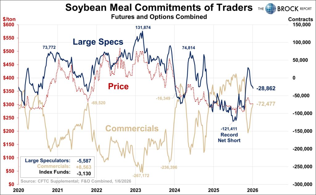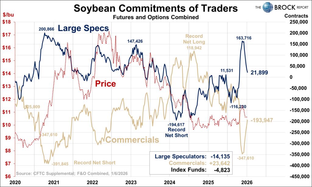 This is far less ambiguous than the corn COT, and the chart immediately below should make EVERYONE a believer of the importance of COT data. Specs bough the daylights out of the soybean complex as rumors of a trade deal with China emerged and developed, and then sold the dickens out of it as the seasonal export window to China closed with nothing having been shipped there. This COT data would have made us much more aggressive, though we did make sales, in November and early December. Water under the bridge.