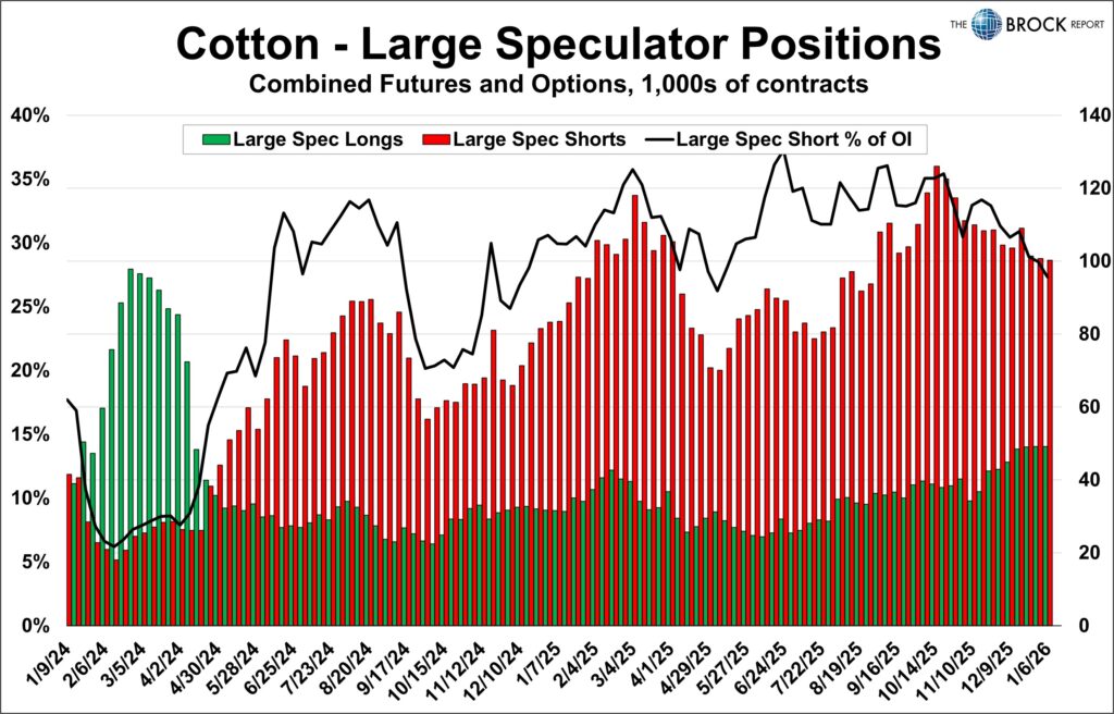 Pretty bullish setup here. Prices have held up relatively well considering the massive selloff from laarge specs over the past several weeks as they went from short 50,000 contracts to 110,000. Now large specs are sitting near historically large net short sizing, while commercials are approaching their record net long established in the first half of 2025. Be patient in the market, there is real potential for a rally here, like in cotton, if something fundamental can get the market moving.