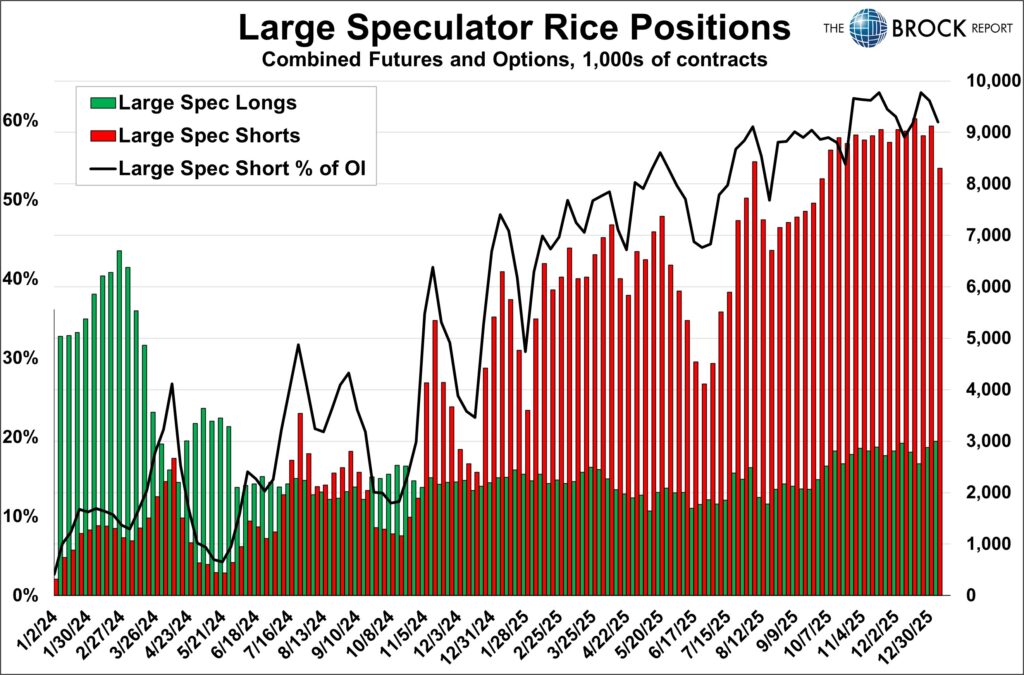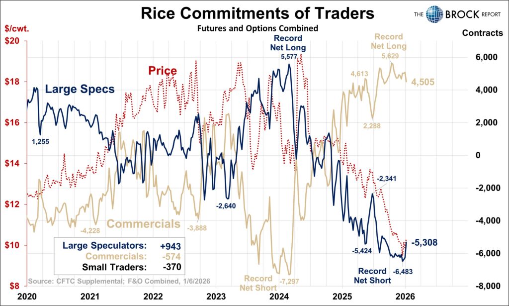 This is as bullish of a setup as you will ever see. Specs coming off a record short, commercials coming off a record long, and prices, well lets not talk about the prices. There is a LOT of room to the upside and a lot of dry powder for specs to spend. You can see two charts below that this latest net buying came from very aggressive short covering, and you can also see they still have a TON of shorts to liquidate. This looks very good for rice producers, and it has been a long time since anything about this market looked good to them. Do not be advancing rice marketings.