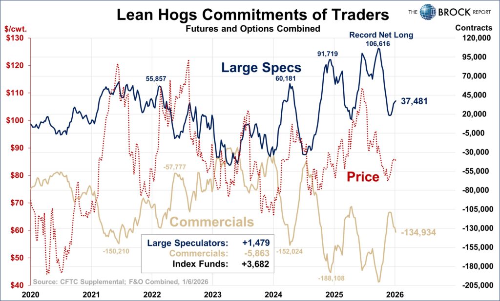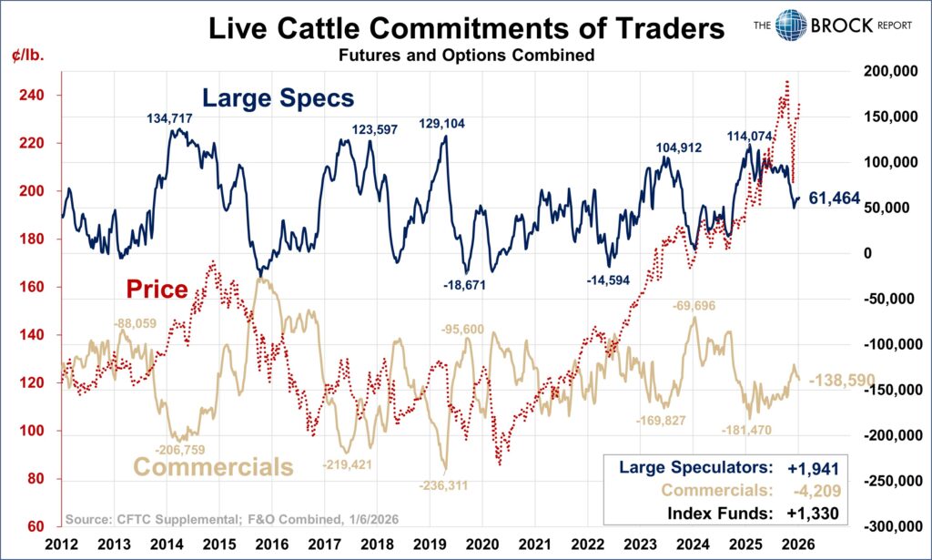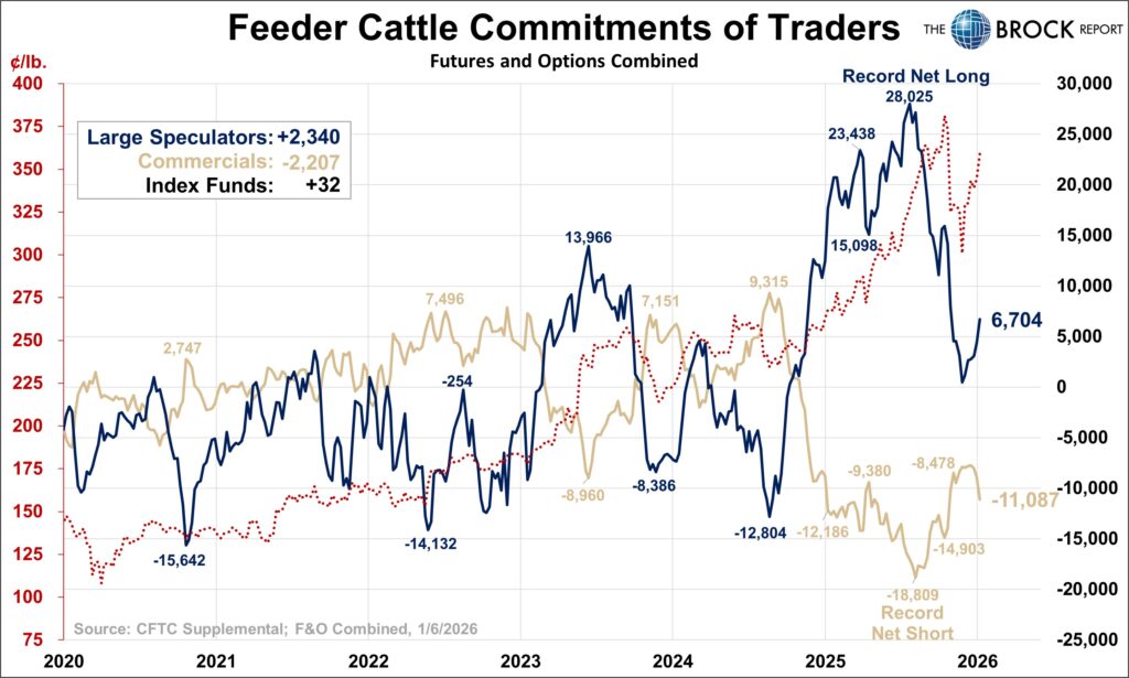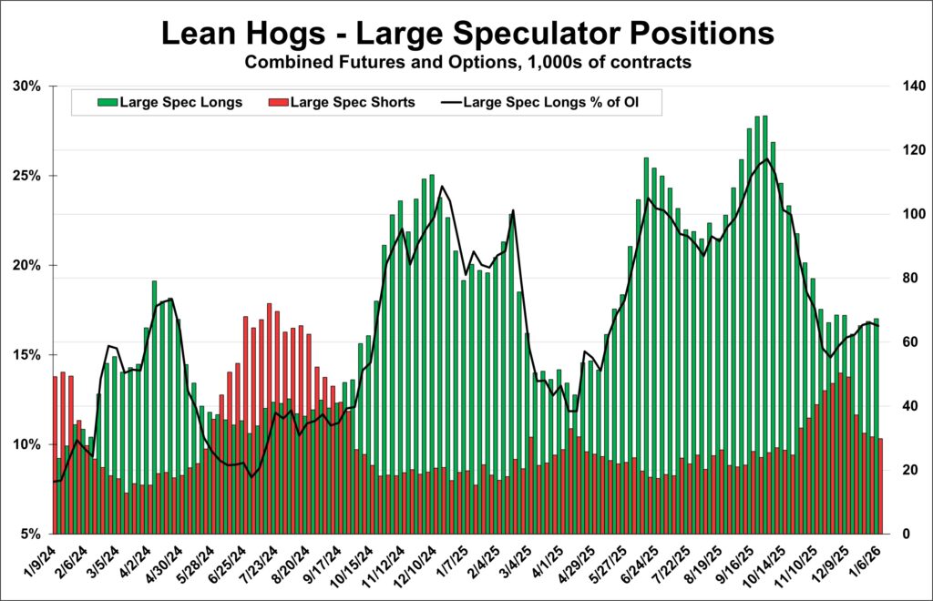 Both fats and feeders have enjoyed a massive rally since mid November, and as suspected large spec buying was a key feature driving that price surge. In both cases specs have a lot of room to build larger long position and still be well under their record positions, so we are going to be looking for significant sell signals before we recommend hedges in either of these markets. Price action late in the week did not look good, so be alert for recommendations.