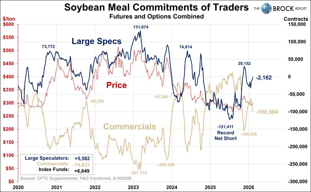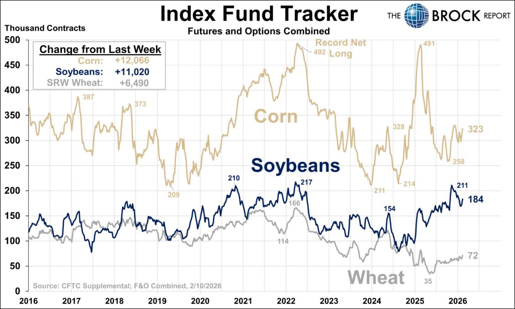 Large specs were net buyers of the C/B/W complex as a whole, though modest sellers of wheat. Index funds were buyers of all three.