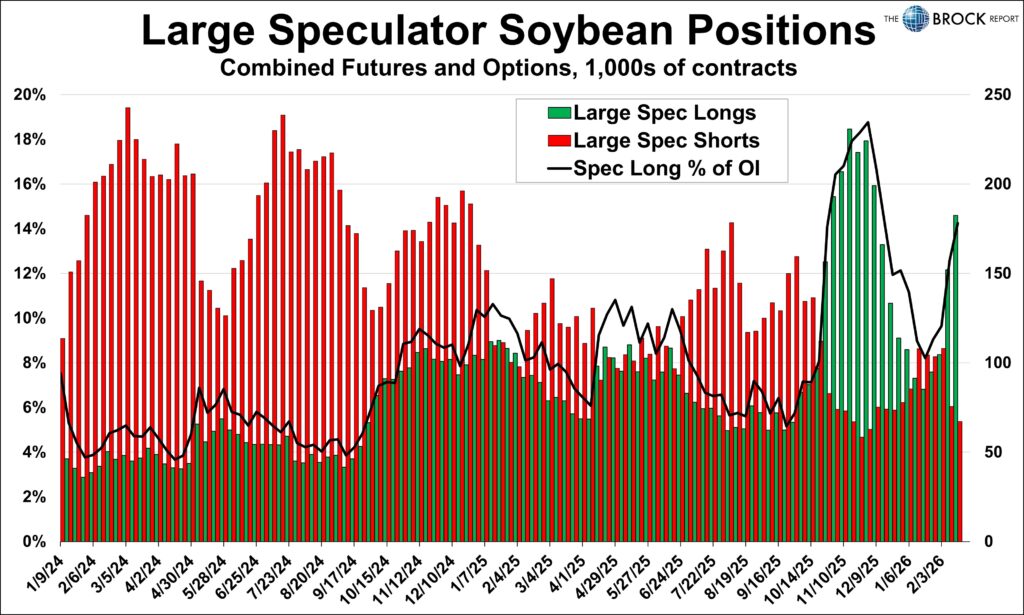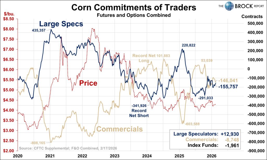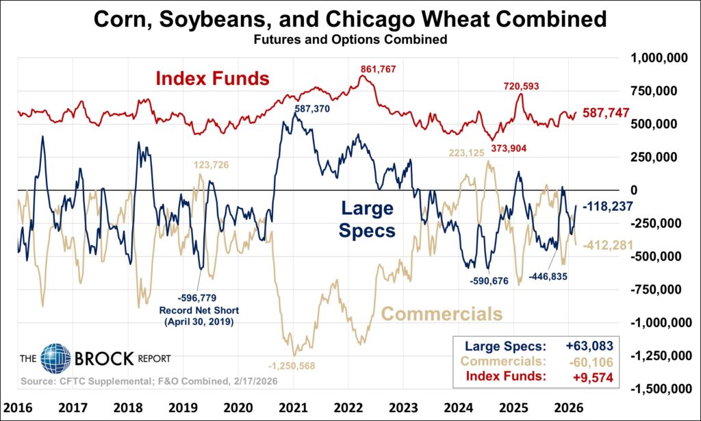 Corn speculators were small buyers for the week ended Tuesday. Not a large amount of buying, but we’ll take it as the setup continues to leave room for speculators to go on a buying streak, as we have been mentioning. Including this week, specs one month position change is +47,677 contracts, not much happening in this market since the start of February. In fact, going back to the 1/13/26 report the average weekly position change has only been a little over 15,000 contracts.