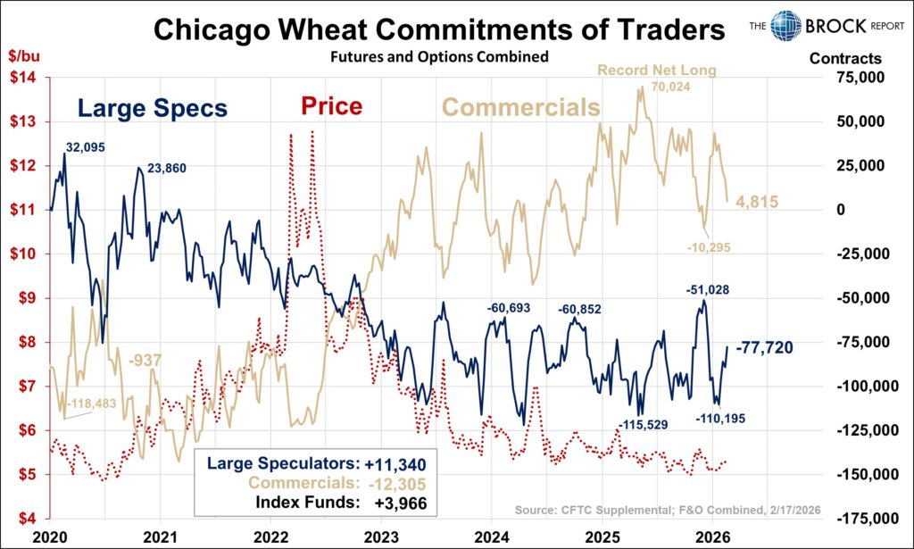 Large specs have now been buyers for 11 straight weeks. That steady shift in positioning has been notable, especially considering the lack of a major fundamental change during that stretch. When specs build length this consistently without a clear shift in the fundamentals, it can leave the market vulnerable. Even though large specs are not holding a meaningful net long position yet, the pace of recent buying increases the risk of liquidation if momentum stalls. In other words, it doesn’t require a record net long for a setback to occur it only takes buying to slow down, and it seems that’s exactly what has happened in this market this week.