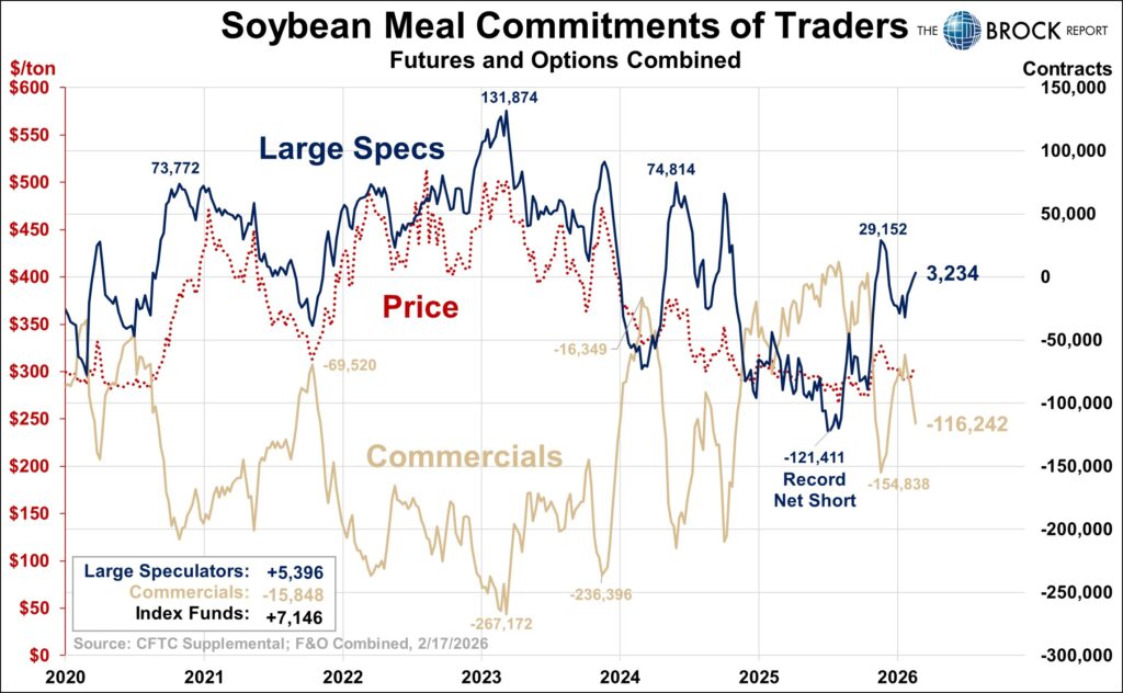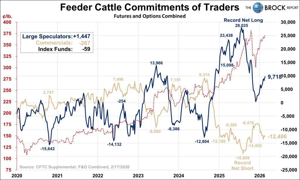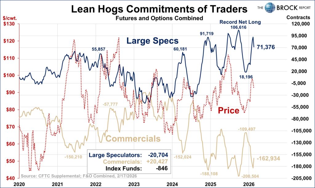 Selloff beginning? Large specs were sellers of just over 20,000 contracts this week, the largest weekly selling since March of last year. However, the timing of the report highlights an important point. The April Lean Hog contract has already closed roughly $5 off its recent high. By the time speculative selling shows up clearly in the COT data, the market may have already made a significant move. This is why the COT report should be used as a confirmation tool, not a trigger by itself. Price action often turns first, and positioning data follows. The key is reading the chart and recognizing positioning, rather than waiting for the report to make the decision for you.