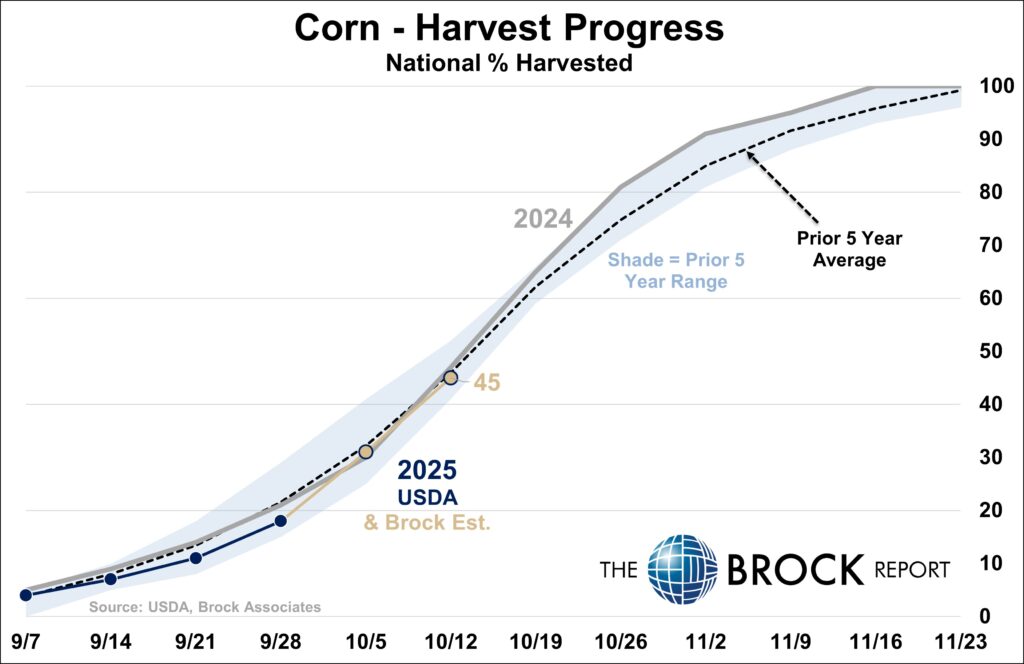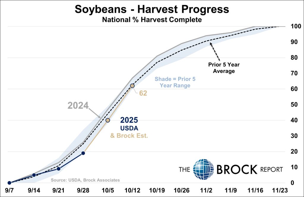 • Producers likely making large gains in the past week. No bumps in the road so far, as Corn and Soybean harvest is about halfway completed.