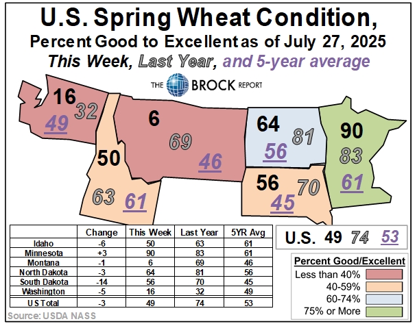 - Spring wheat conditions fell 3 points nationally, and 14 points in SD.