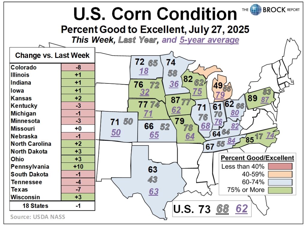 - Corn conditions fell one point after holding steady three consecutive weeks, despite improving in IA, IL and IN