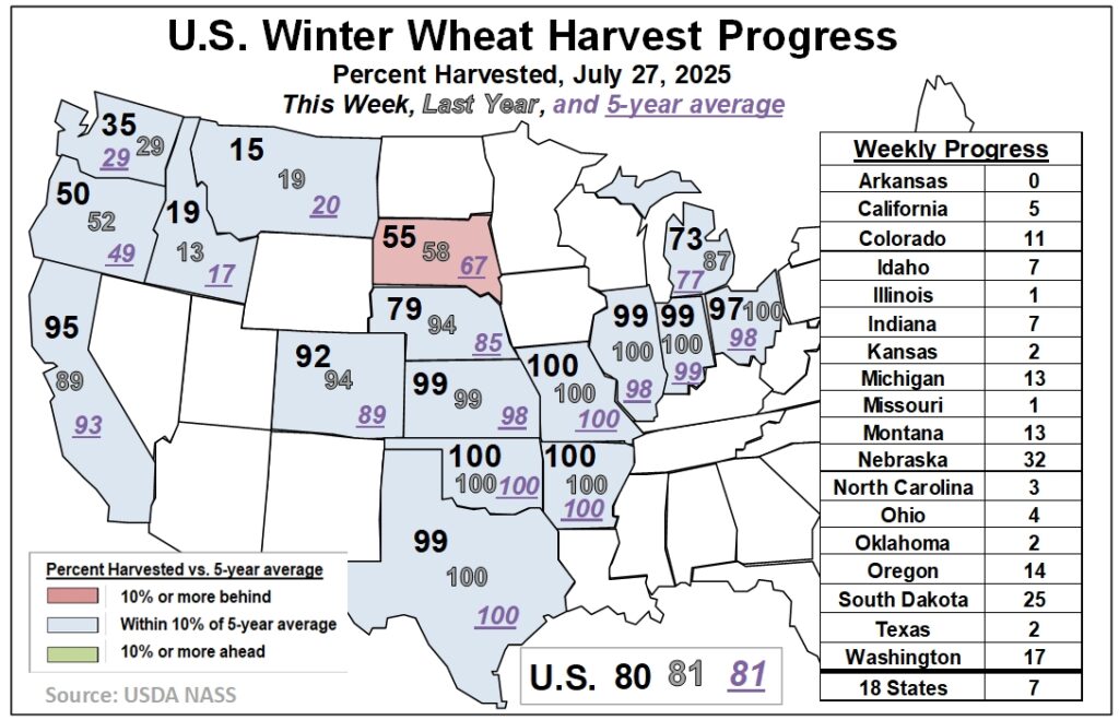 - Winter wheat harvest has caught up to normal pace, though SD is 12% points behind 5 YR Avg.