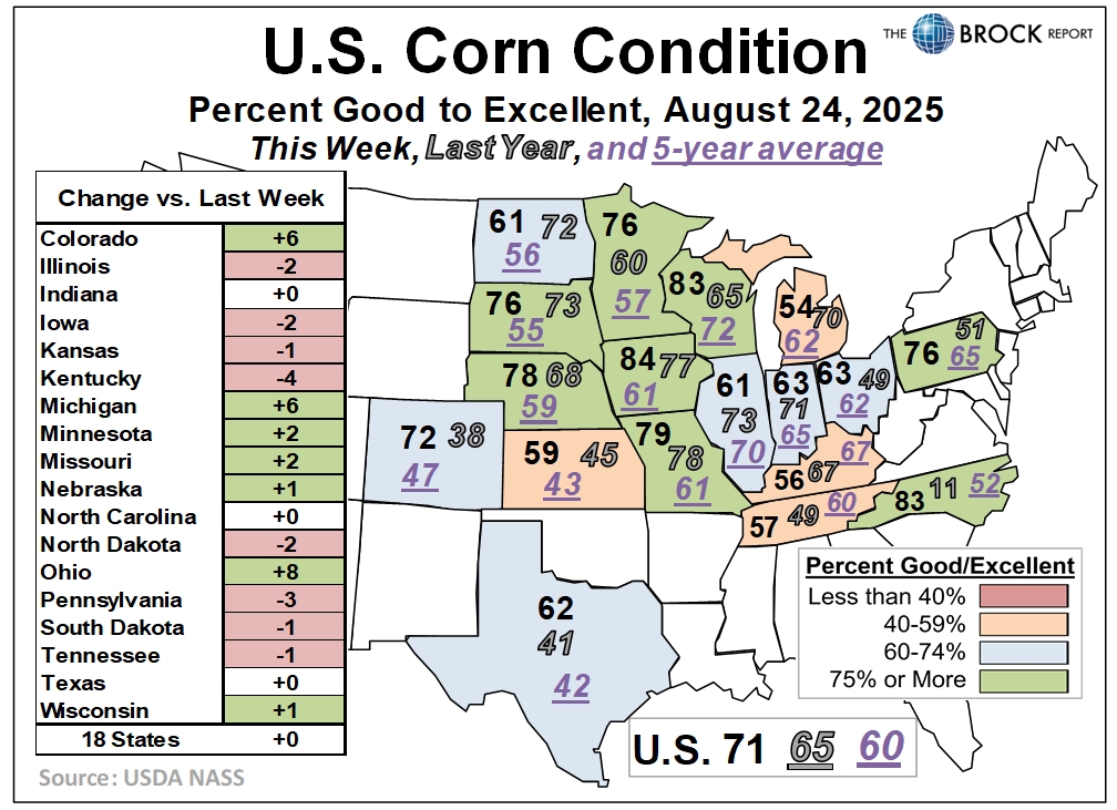 - Corn: No national change in condition overall. A few larger positive moves helped offset a greater number of smaller declines—8 of the 18 reported states made negative changes. Notably, Ohio improved by 8 points, while Colorado and Michigan each rose by 6. On the downside, Kentucky, Illinois, Iowa, North Dakota, and Pennsylvania all declined by 2 points or more.