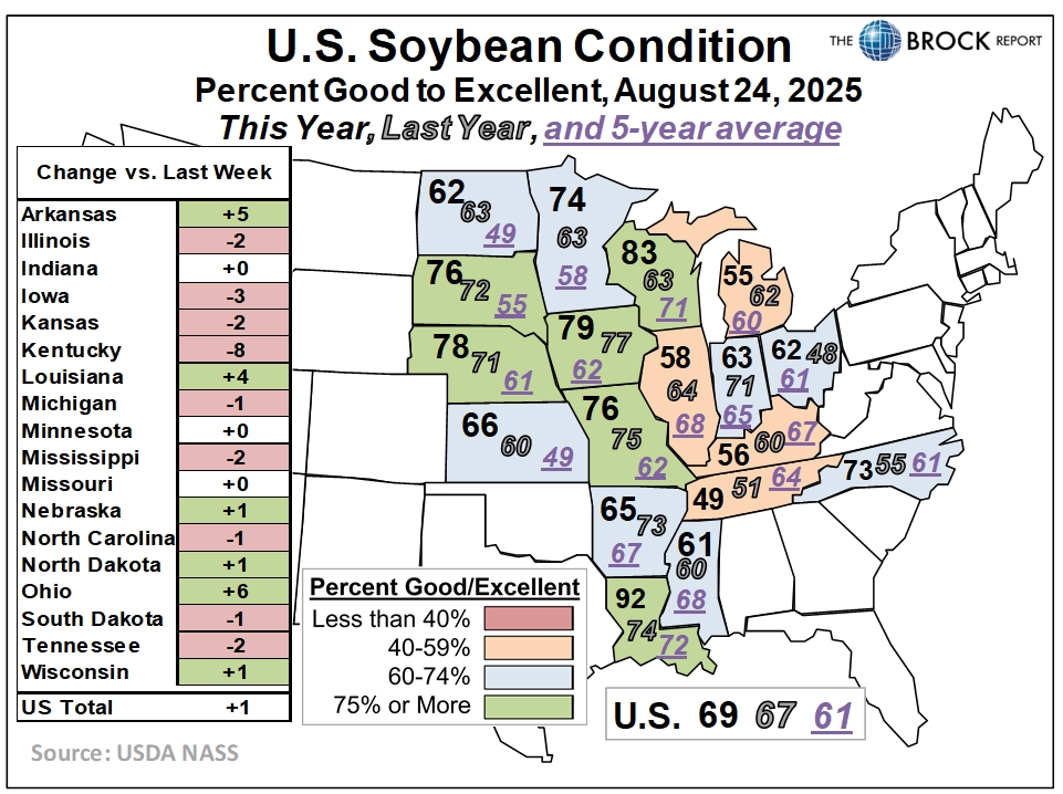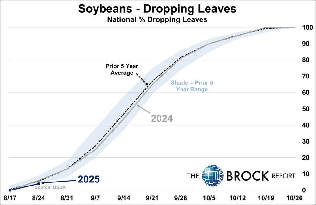 - Soybeans: National condition up 1 point this week, but otherwise a similar story to corn. Ohio, Louisiana, and Arkansas each improved by 4 points or more, while a long list of states saw declines of 2 points or more. Dropping Leaves reported for the first time in 2025, coming in at the lower side of the 5-year range.