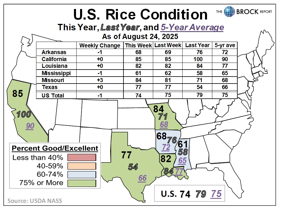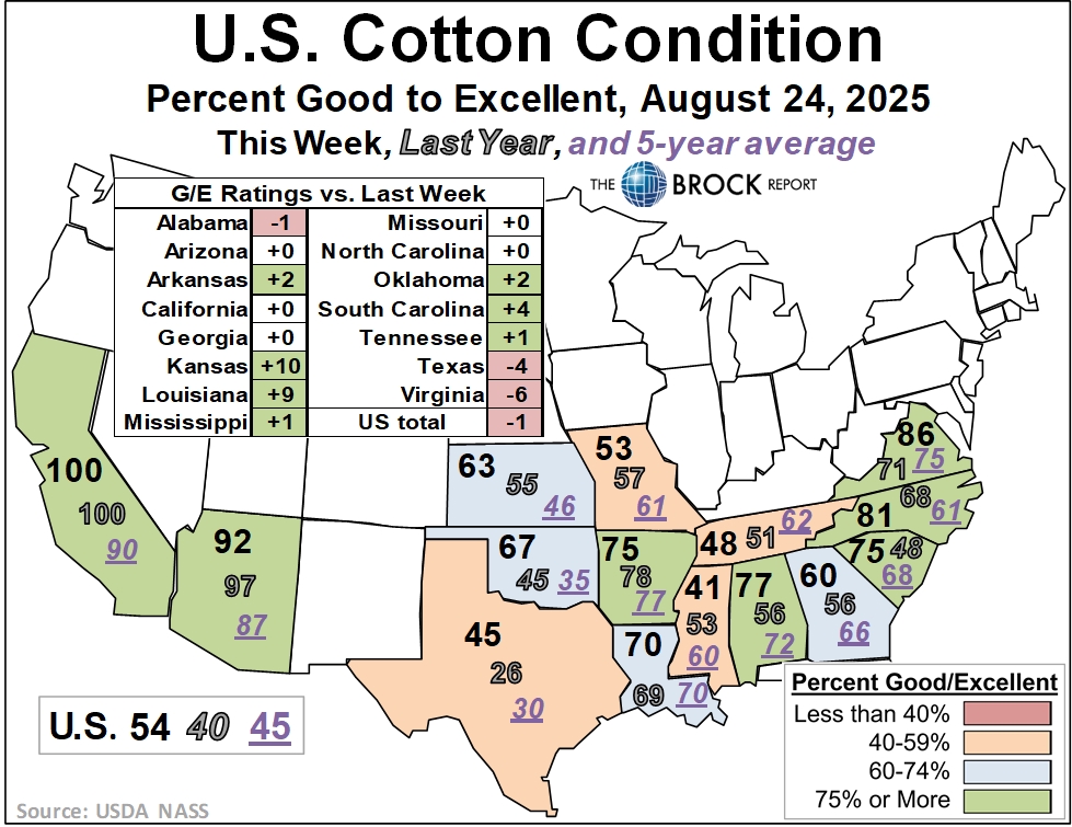 - Cotton: Despite big increases in Kansas and Louisiana, the national condition slipped by 1 point this week.