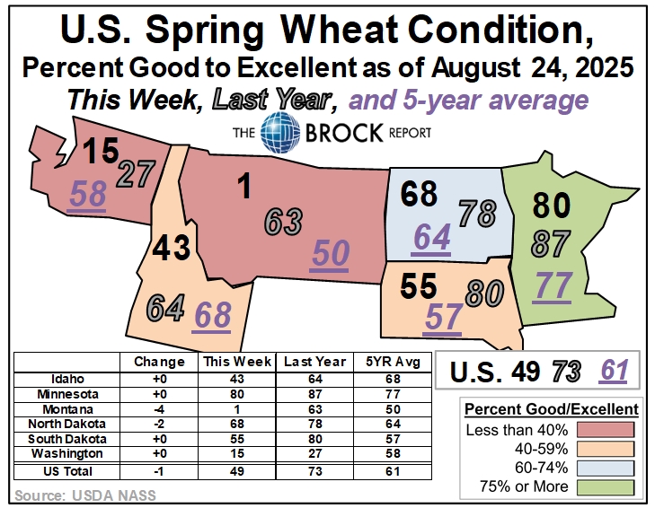 - Spring Wheat: Montana and North Dakota both declined compared to last week, while conditions remained unchanged for the rest of the reported area. Down 1 nationally.
