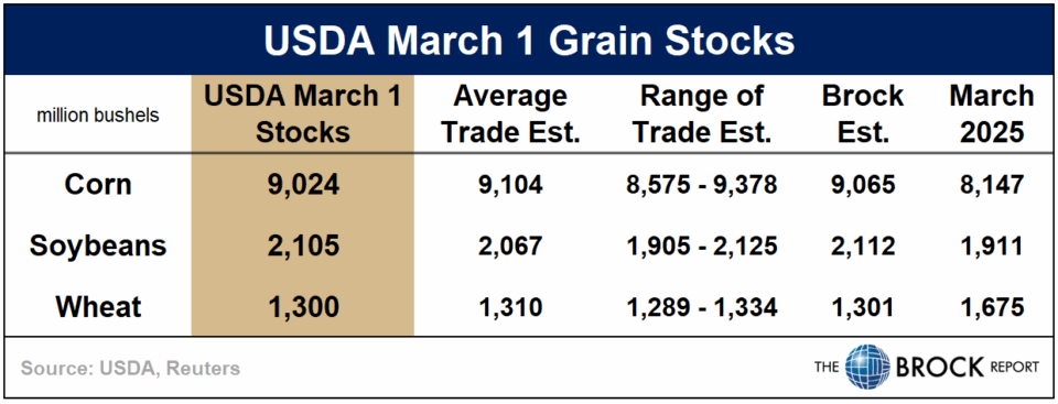 The USDA’s quarterly Grain Stocks report, released yesterday, offered updated estimates for corn, soybean, and wheat inventories as of March 1. The data largely aligned with expectations, with no major surprises across the board. Corn stocks showed the largest deviation from our estimate, though the difference was relatively minor at just 59 million bushels lower.