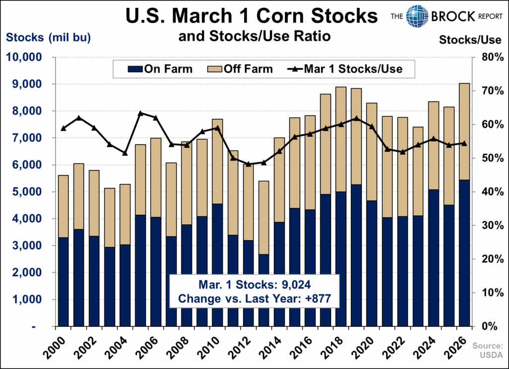 The USDA pegged 2025/26 March 1 corn stocks at 9,024 million bushels, the highest March 1 inventory on record. Of that total, 5,432 million bushels are held on-farm, with the remaining 3,592 million stored off-farm. Despite these record-large inventories, the stocks-to-use ratio for the December–February quarter came in at just 54.4%, a relatively tight figure given the supply backdrop. For comparison, the last time March 1 stocks approached similar levels (2017–2019), stocks-to-use ratios pushed as high as 62%. This highlighting the strength of demand, particularly from exports and feed usage.