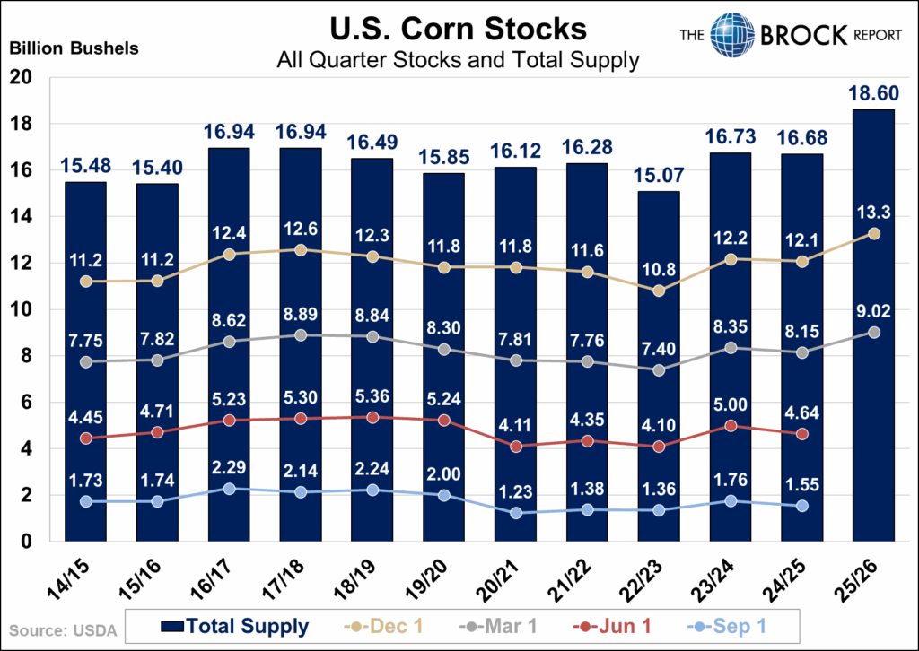 Looking at the All Quarters Stocks chart, elevated stock levels are largely a function of record supply, with 2025/26 total supply coming in at 18.6 billion bushels. March 1 corn stocks as a percent of that supply sit at 48.53%, the third lowest among the years shown. This reinforces the narrative of strong usage, as a historically large supply is being worked through.