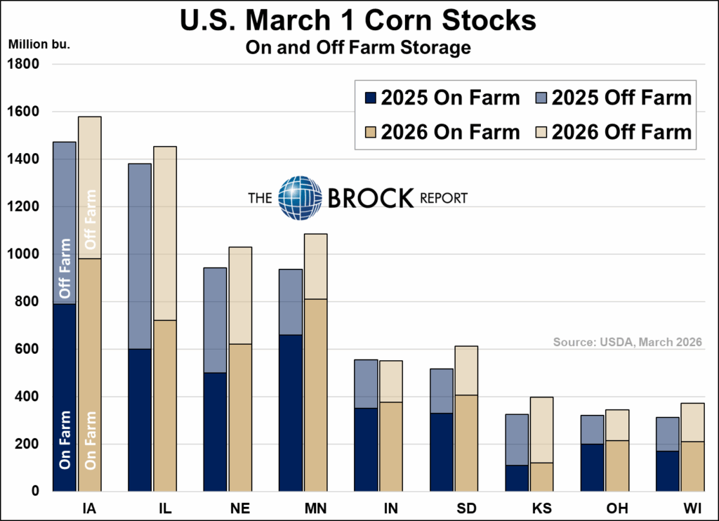 March 1 corn stocks increased across most major states year-over-year, with gains in both on-farm and off-farm storage. Larger inventories in states like Iowa, Illinois, and Minnesota highlight the large supply, while increased on-farm storage suggests producers continue to hold large amounts of corn.