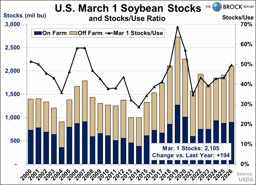 The soybean inventory numbers show totally different story than corn. Despite lower overall U.S. supplies compared to a year ago, stocks remain elevated, with March 1 inventories at 2,105 million bushels. Of that total, 900 million bushels are held on-farm, with 1,205 million off-farm. The stocks-to-use ratio came in at 49.7%, up more than 6 percentage points from a year ago.