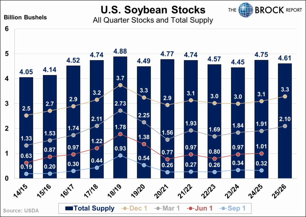 March 1 soybean stocks as a percent of total supply came in at 45.7%, the highest since 2020. For comparison, last year’s March 1 stocks were closer to 40% of supply. This higher percentage reflects softer demand, particularly in the export market from China.