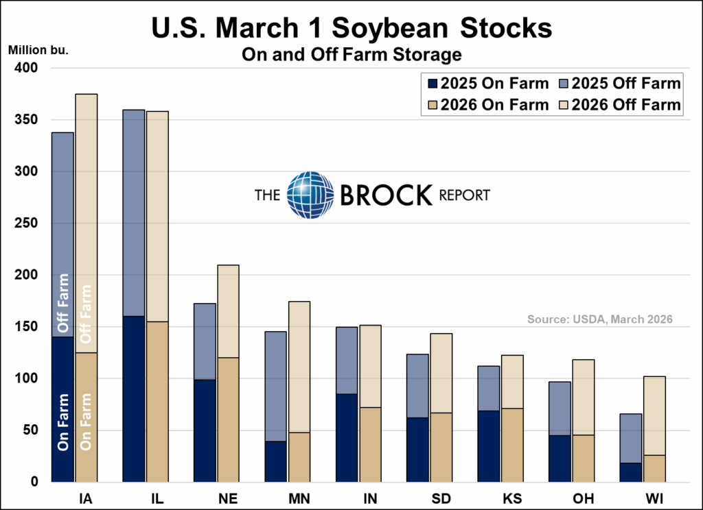 Despite the large increase in overall March 1 stocks, on farm storage was up just 23 million bushels. Supported largely by decreases in soybeans on-farm in the two key states of Iowa and Illinois.