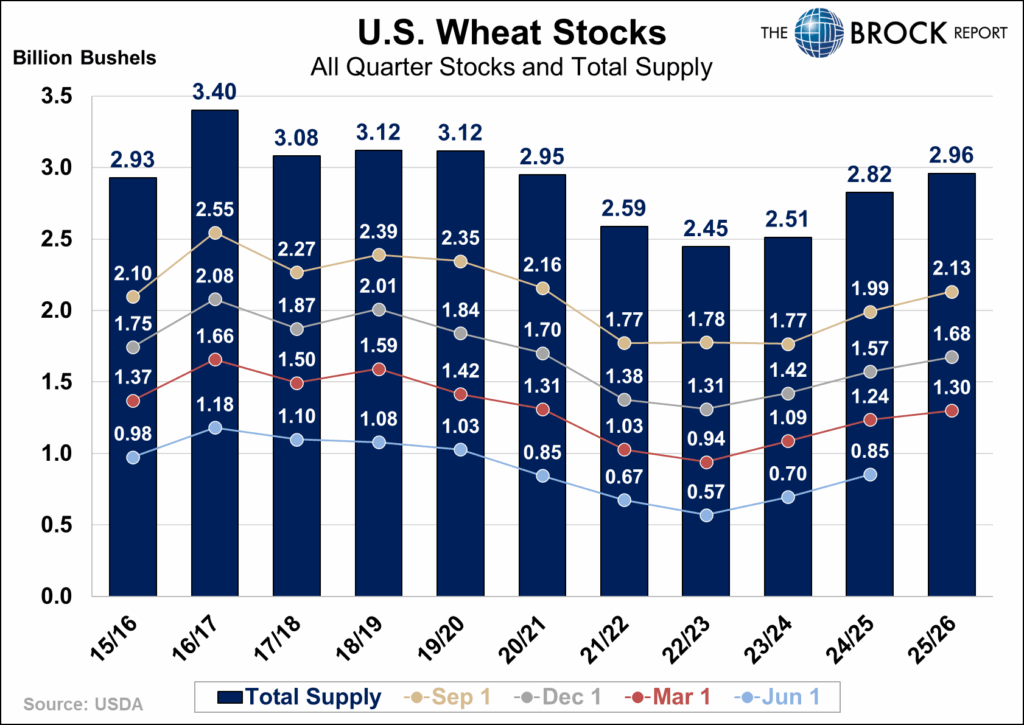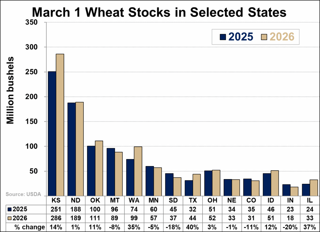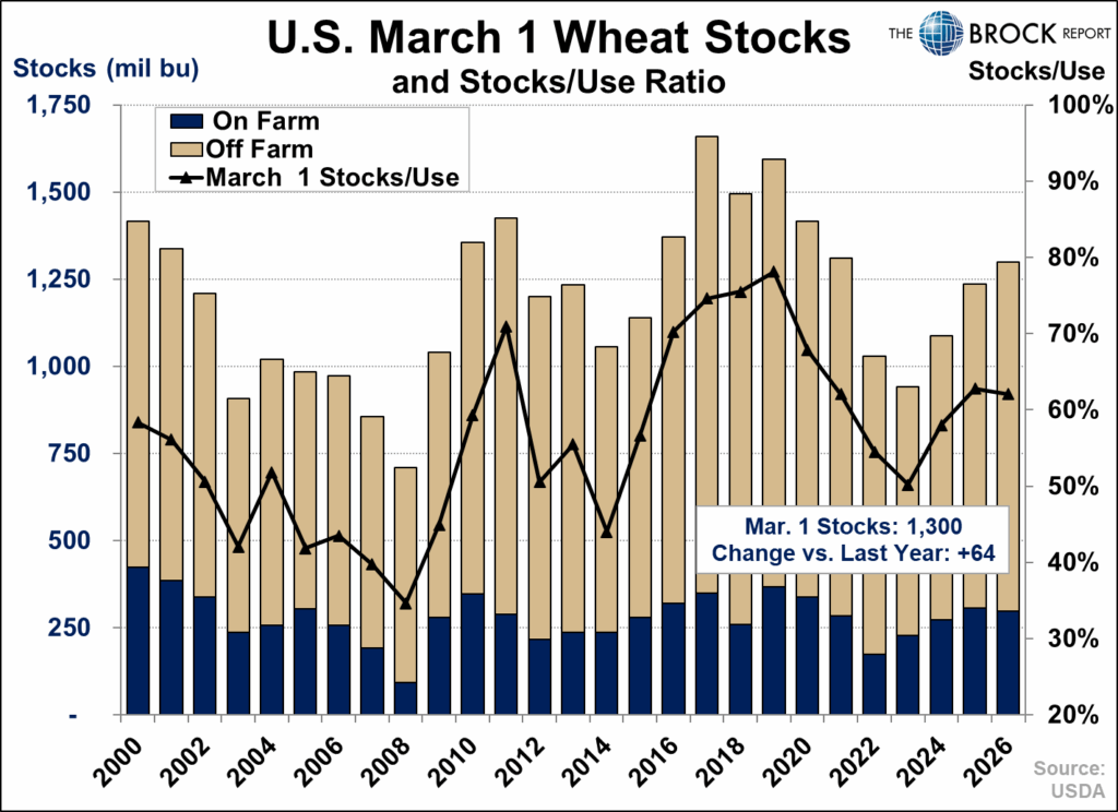 The wheat inventory picture looks more similar to corn, with stronger usage offsetting higher stocks. March 1 wheat inventories totaled 1,300 million bushels, including 298 million on-farm and 1,002 million off-farm. Despite stocks being up year-over-year, the stocks-to-use ratio declined to 62.1%, down more than 1 percentage point from last year.