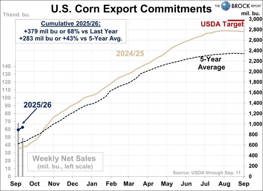 Net U.S. corn export sales for the week ended Sept. 11 came in at 48.5 mil. bu. compared with trade expectations that ran from 23.6 mil. bu. to 74.8 mil. and the previous week’s new sales of only 21.3 mil. bushels. The export sales data looks neutral for corn prices.