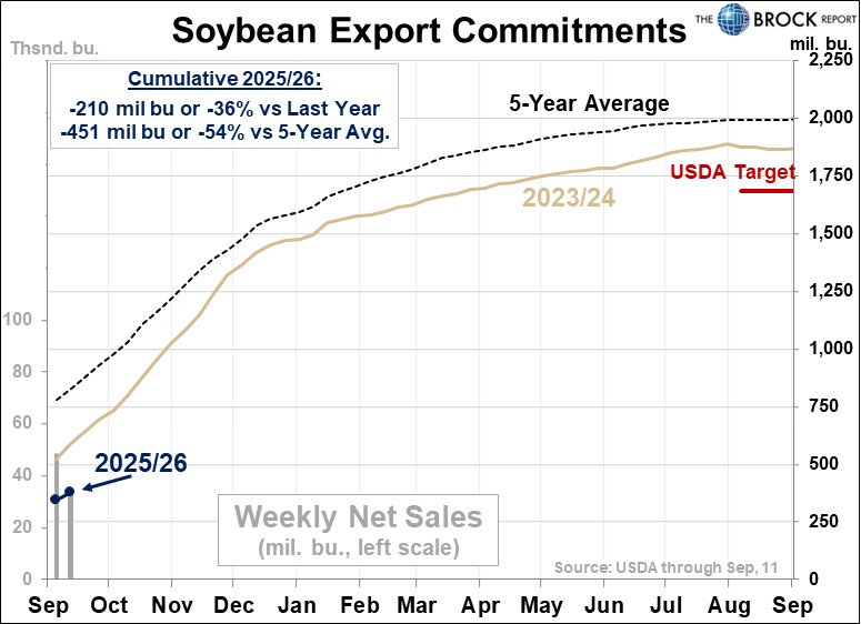 Net weekly U.S. soybean export sales totaled 34.0 mil. bu. compared with trade expectations that ran from 14.5 mil. to 55.0 mil. bu. and the previous week’s new sales of 19.9 mil. bushels. The sales total looks neutral for soybean prices, but China remained absent from the list of buyers, which may put some further pressure on prices.
