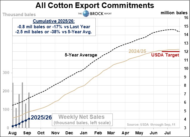 Net U.S. cotton export sales for the week ended Sept. 11 totaled 186,100 running bales for 2025-26 delivery and 19,000 for 2026-27 delivery. Sales were up from 129,600 running bales a week earlier and should be supportive for cotton prices.