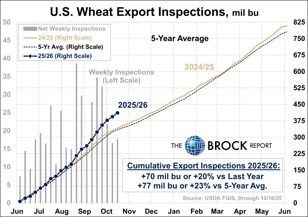 The U.S. wheat export outlook is as strong as it has been in years. Wheat export inspections for 2025/26 as of Oct. 16 totaled 411 million bushels, 70 million bushels or 20% higher than a year earlier, and 23% above the five-year average. The last time inspections were higher as of mid-October was 2016/17. USDA in September forecast U.S. wheat exports would reach 900 million bushels, up about 9% from a year earlier. As of now, U.S. wheat export shipments should still be comfortably ahead of the seasonal pace needed to reach that forecast. We anticipate that when USDA resumes its monthly Supply/Demand reports, hopefully in November, that it will raise its export forecast further. USDA is likely to be cautious, though, as recent data indicates 2025/26 world wheat production and supplies exceed its September estimate.