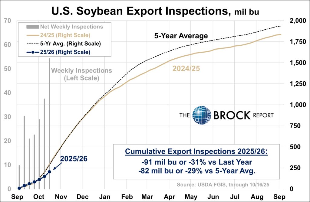 Soybean export inspections for 2025/26 delivery as of Oct. 16 totaled 203.5 million bushels, 91 million bushels or 31% below a year earlier and 29% below the five-year average amid China’s likely continued absence from the U.S. market. Since USDA in September projected 2025/26 exports would total 1.685 billion bushels, 10.1% below a year earlier, export shipments are not running quite as far behind the expected pace. We must remember, though, that U.S. soybean shipments are usually concentrated during September-January and fall off sharply after that as new-crop Brazilian soybeans reach market. The export pattern might be a bit different this year, if China agrees to some sort of soybean purchase deal as part of a trade agreement, but new-crop Brazilian beans will still likely dominate the export market next spring and summer.