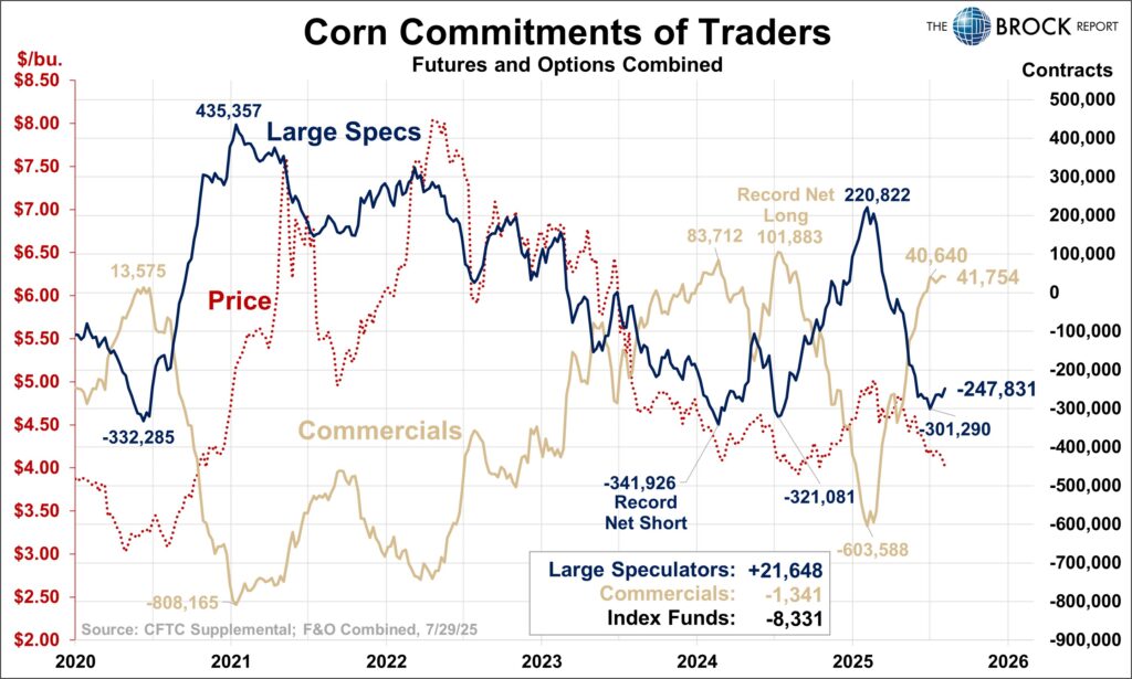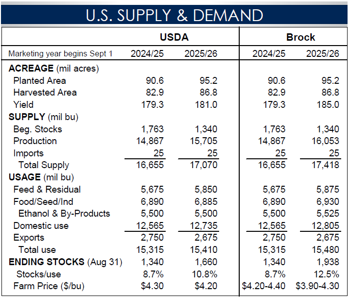 Hedgers’ strategy: Old-crop is long gone. In the new-crop, 30% is covered with cash contracts. An additional 20% is covered with options positions. 10% is covered with long December $4.70 puts/short (2) December $5.40 calls that established a floor of approximately $4.70. The other position is long July 2026 $4.70 puts/short (2) July 2026 $5.40 calls. Also putting in a floor of about $4.70. Another 10% is covered by a Mar. Futures hedge.