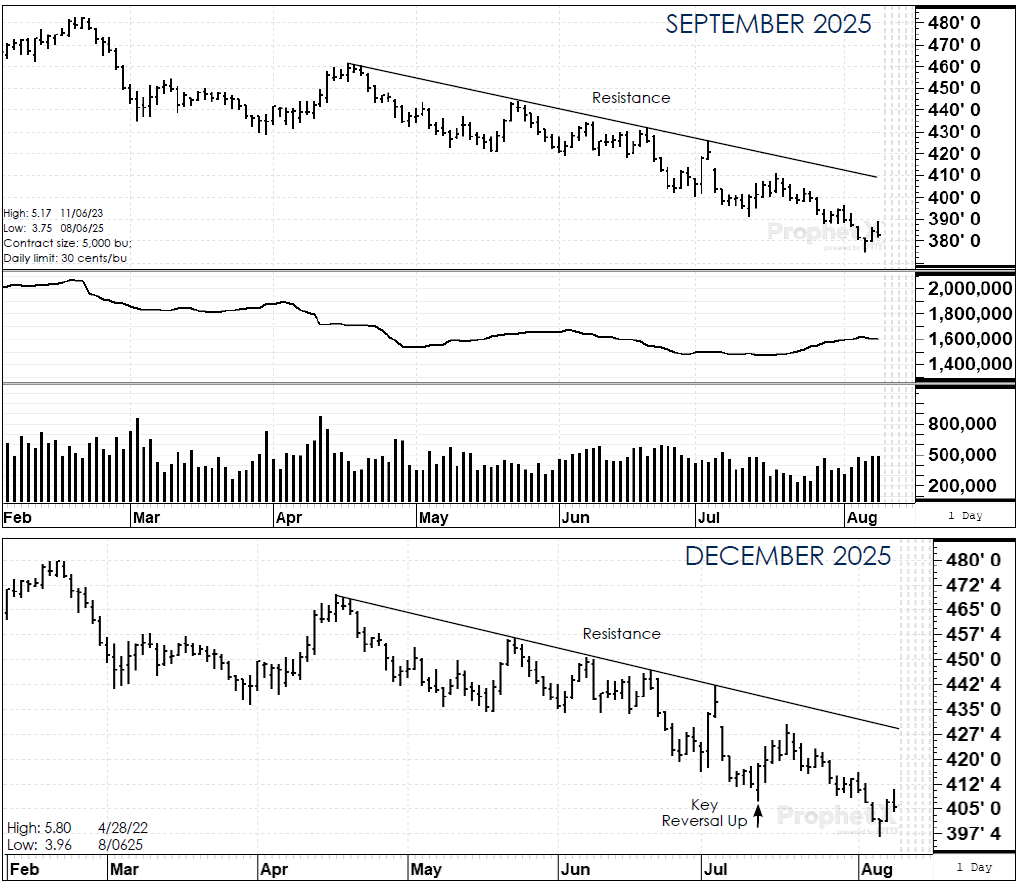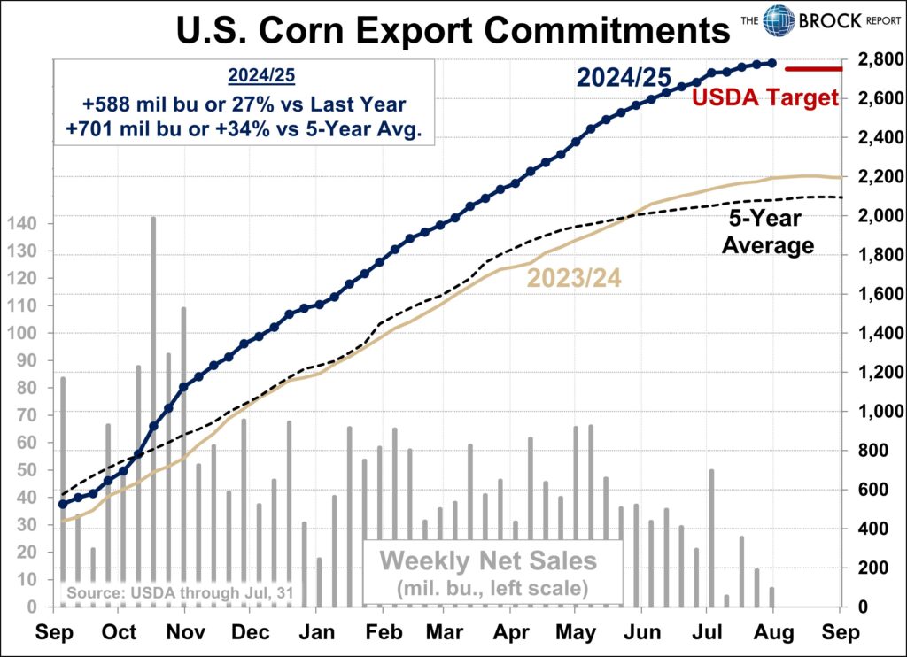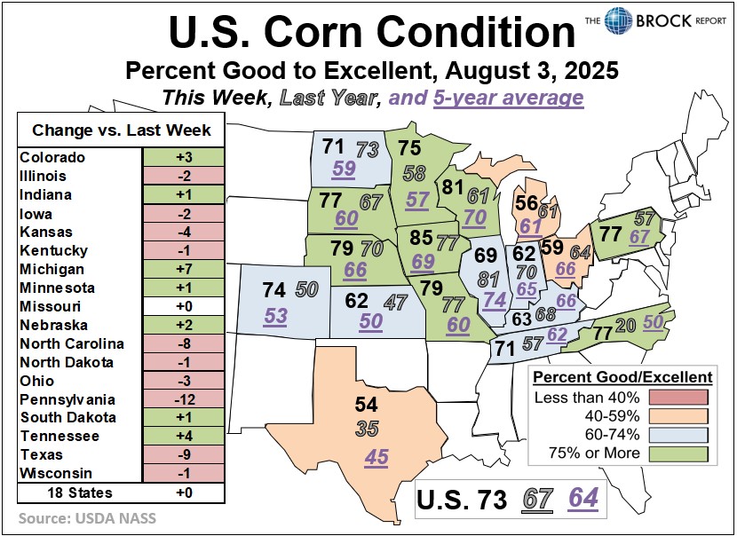 Yield estimates keep ramping up, many believable forecasts as high as 189 bushels per acre. At this stage our assumption is the market is trading on a 185-bushel yield. In either case, this is going to be a big crop. USDA will have its say on the matter on Tuesday, although it will be far from the final word. While the crop is going to be big regardless, reaching the higher end of yield expectations will require favorable conditions straight up to the finish line. Reports of issues, including tassel wrap and tip back, will be monitored, but they are unlikely to cause the sort of widespread problem that would be a drag on the national yield.