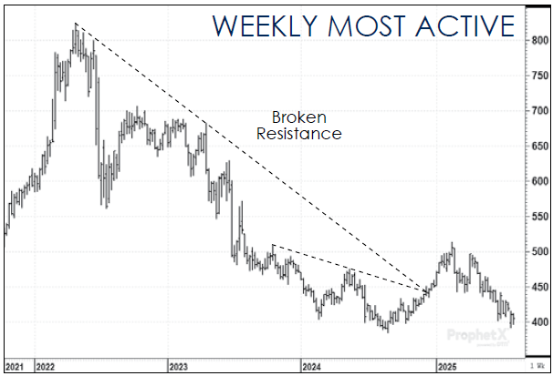 Technically, prices plunged into new lows this week, but March futures were able to find support at approximately $4.15. Resistance is at $4.30. On a weekly continuation chart, support is at $3.60, the low established in July of last year.