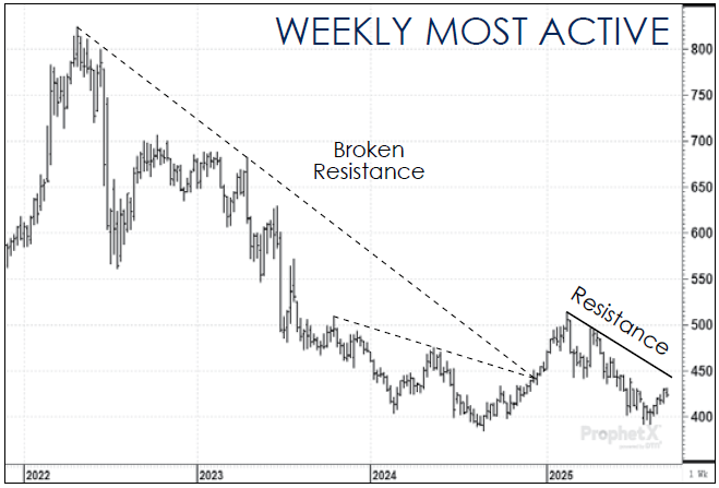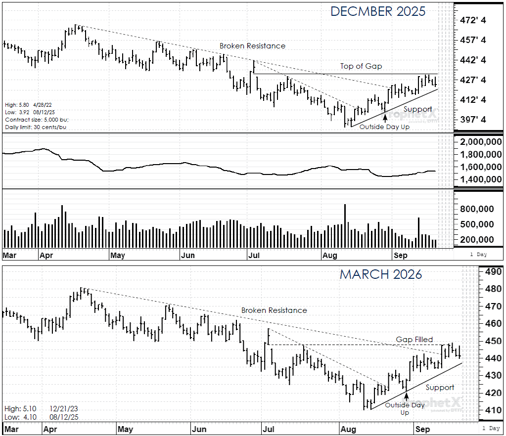 Technically, resistance in the March corn futures is at this week’s high at $4.49 and support is at $4.42. The market has rallied to fill the gap that was left on the charts on July 7. It also has moved up to the resistance area at $4.50 which was the support established April through June. On weekly continuation charts, with the shift from the September contract to the December contract, huge gaps were left on the upside. Some will say that that means nothing because of the contract change. Three months from now, however, everyone will look back at the gap and forget the reason. This will likely be a breakaway gap.