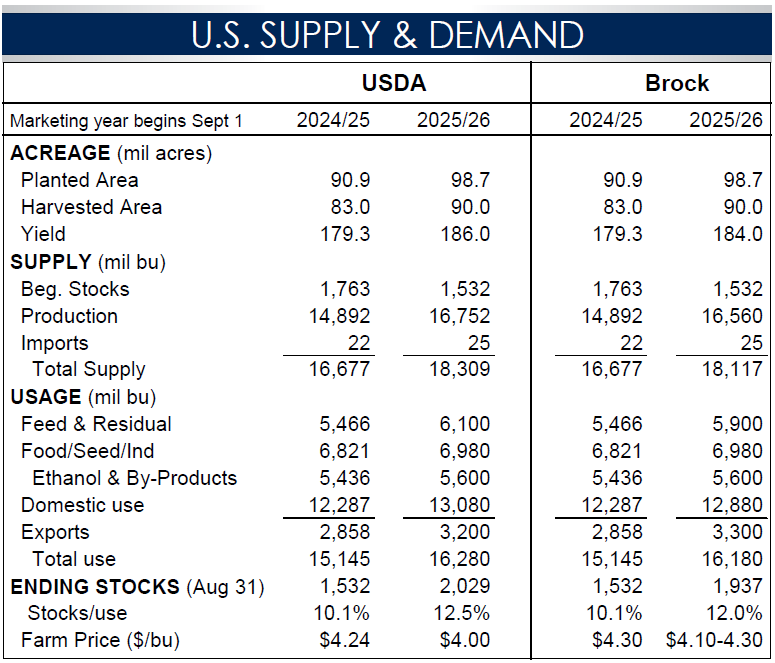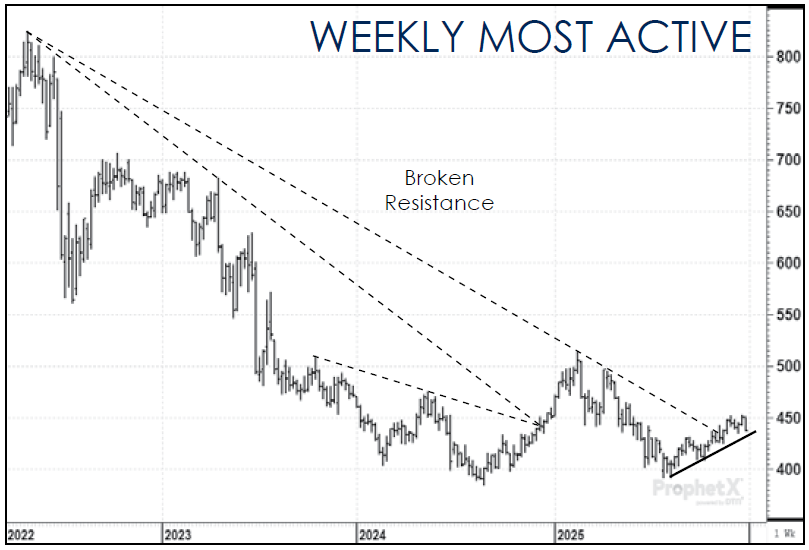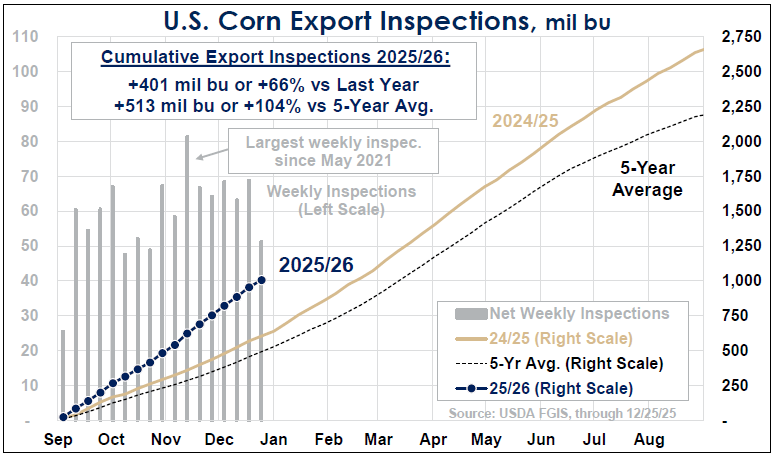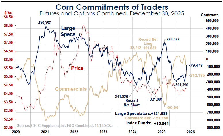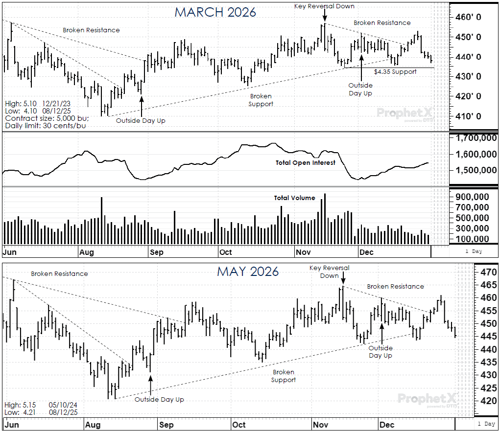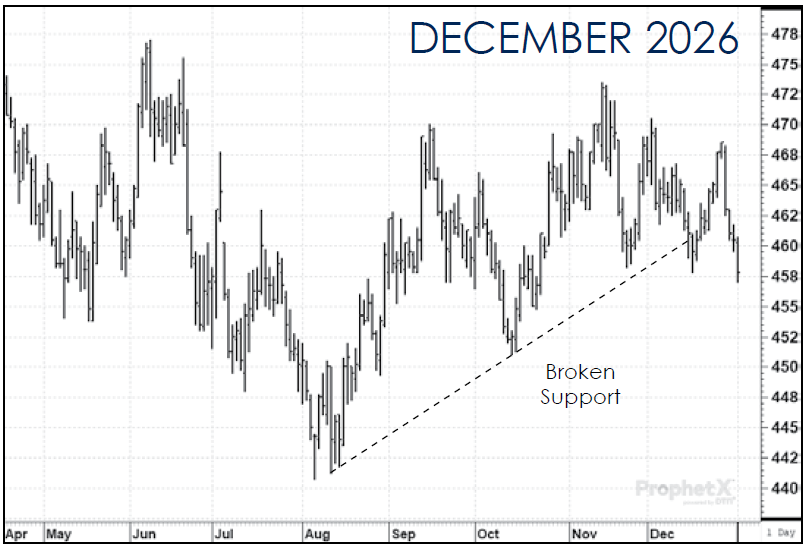 Technically, the trend in corn is still up, but it is testing major support areas which could result in a turn to the downside soon. We are not anticipating that to happen. Near-term support in the March corn futures is at $4.35 while resistance is at $4.50-$4.55. For the early part of 2026, we anticipate the market staying in that range.