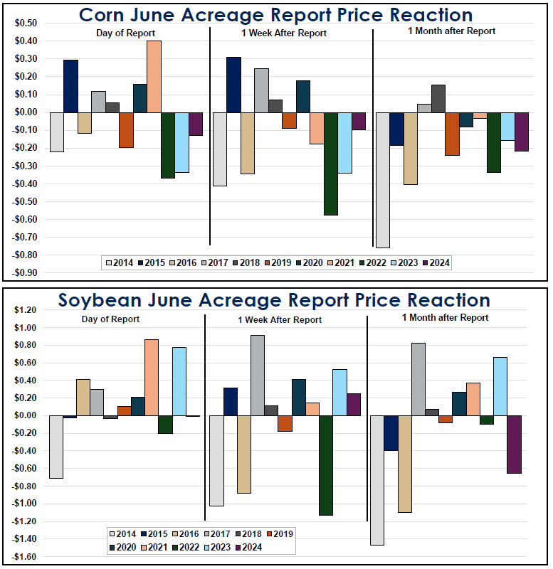 Going into Monday’s annual USDA Crop Acreage report, the corn futures market seems to be factoring in an increase in corn plantings over the March intentions of 95.3 million acres, although on average, the trade expects almost no change. Trade expectations in a Bloomberg survey of 31 analysts average 95.4 million acres. History strongly favors an increase in corn acres from the March intentions. The June corn acreage total has come in above the March intentions eight of the past 10 years, and 16 of the past 20. Corn acreage has also exceeded trade expectations in seven of the past 10 years, and 13 of the past 20. The June acreage has been more than 2% above the average of trade expectations five times in 20 years, but the rise in acreage from March to June has exceeded 2% only three times – in 2007, 2009 and 2023. June corn acreage fell more than 2% below the March intentions and trade expectations only once – in 2020. So, all in all, it would seem that odds of a big surprise for the corn market in the Crop Acreage report are actually low.