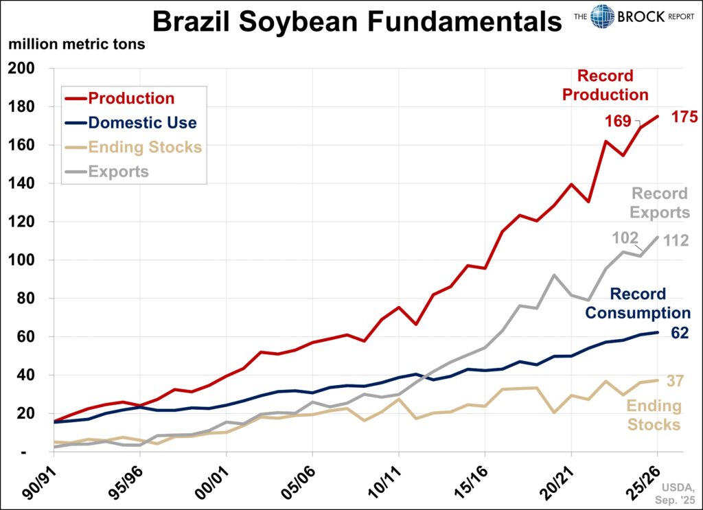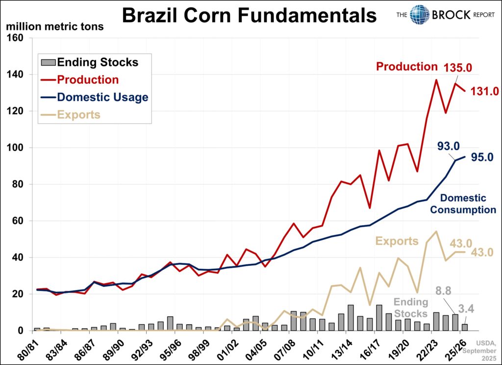Note in the chart of Brazil corn fundamentals that in the last 20 years, Brazil has gone from producing under 40 million metric tons per year to this year’s estimated 131 million metric tons. During the same timeframe, Brazil has gone from producing 60 million metric tons of soybeans to 175 million metric tons.
